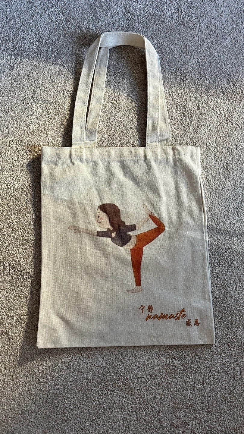 A canvas tote bag. Features handles. An illustration on the front. Perfect for carrying items on your way to yoga class.