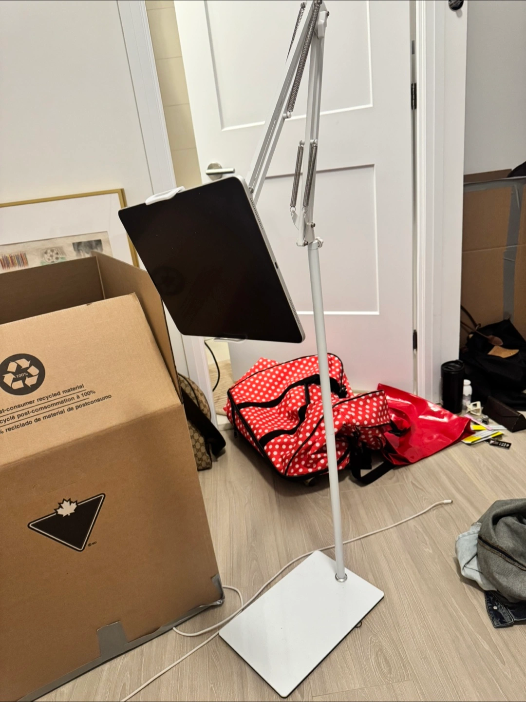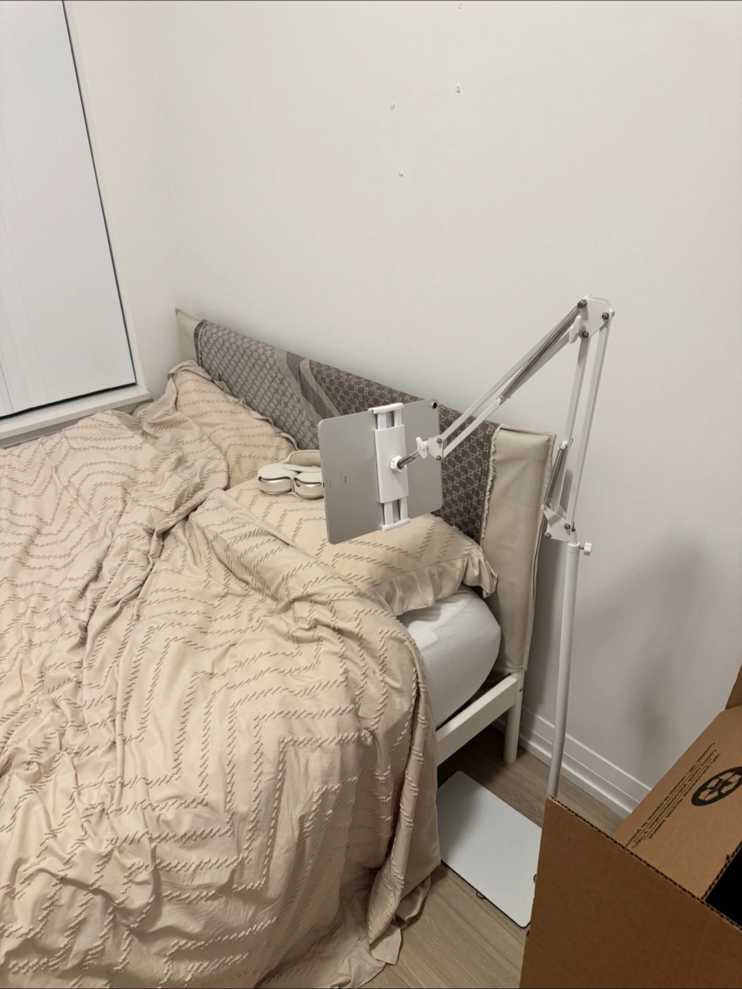 ⭐️A white, adjustable stand. It holds a tablet, the perfect spot for reading comfortably in bed.