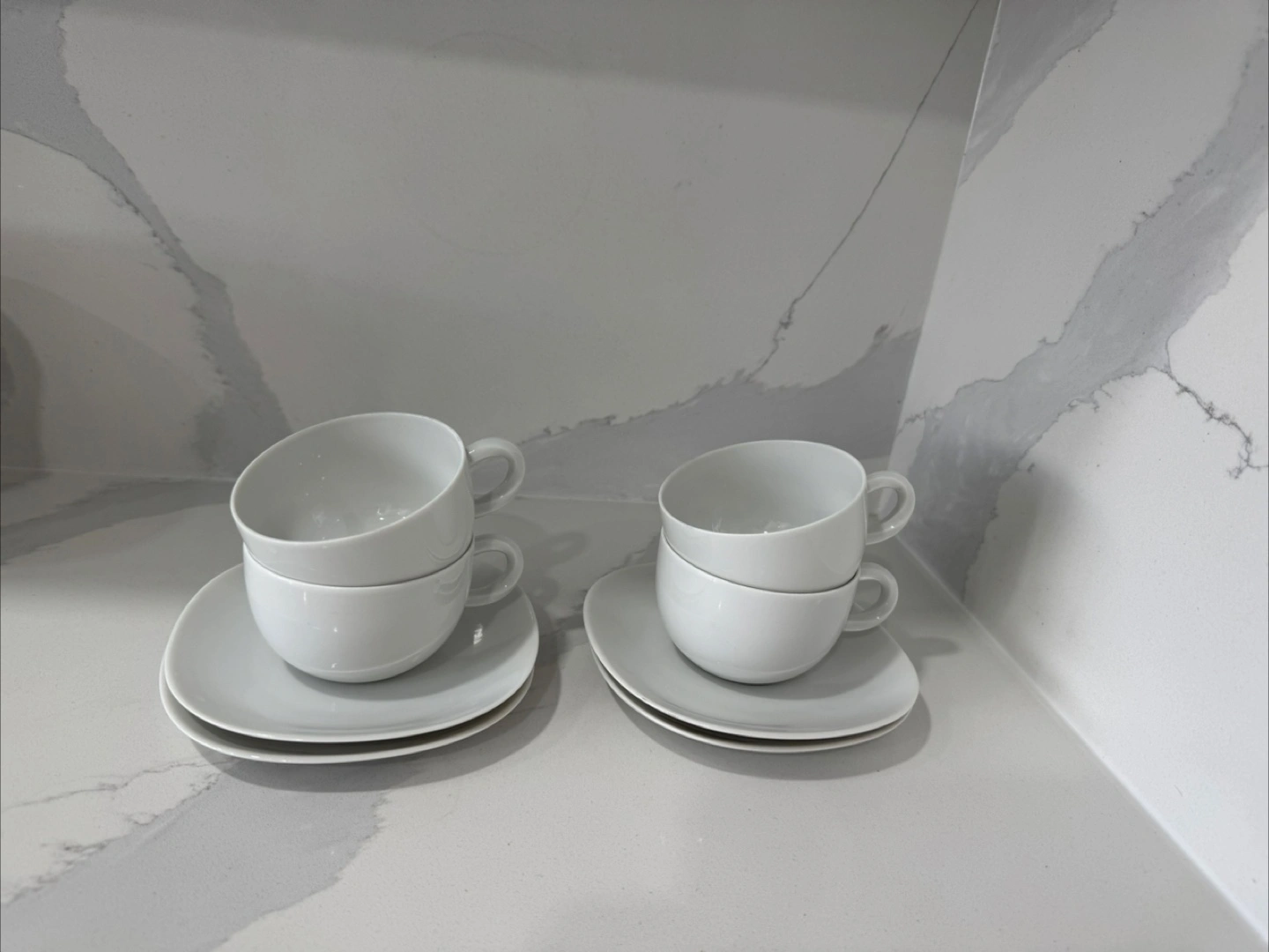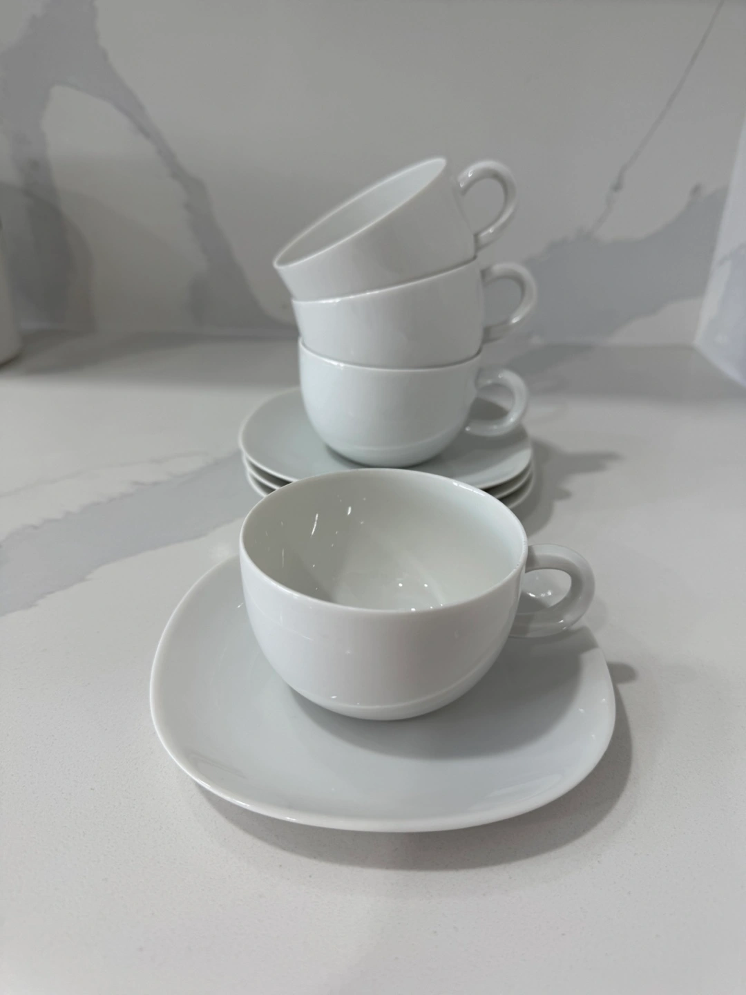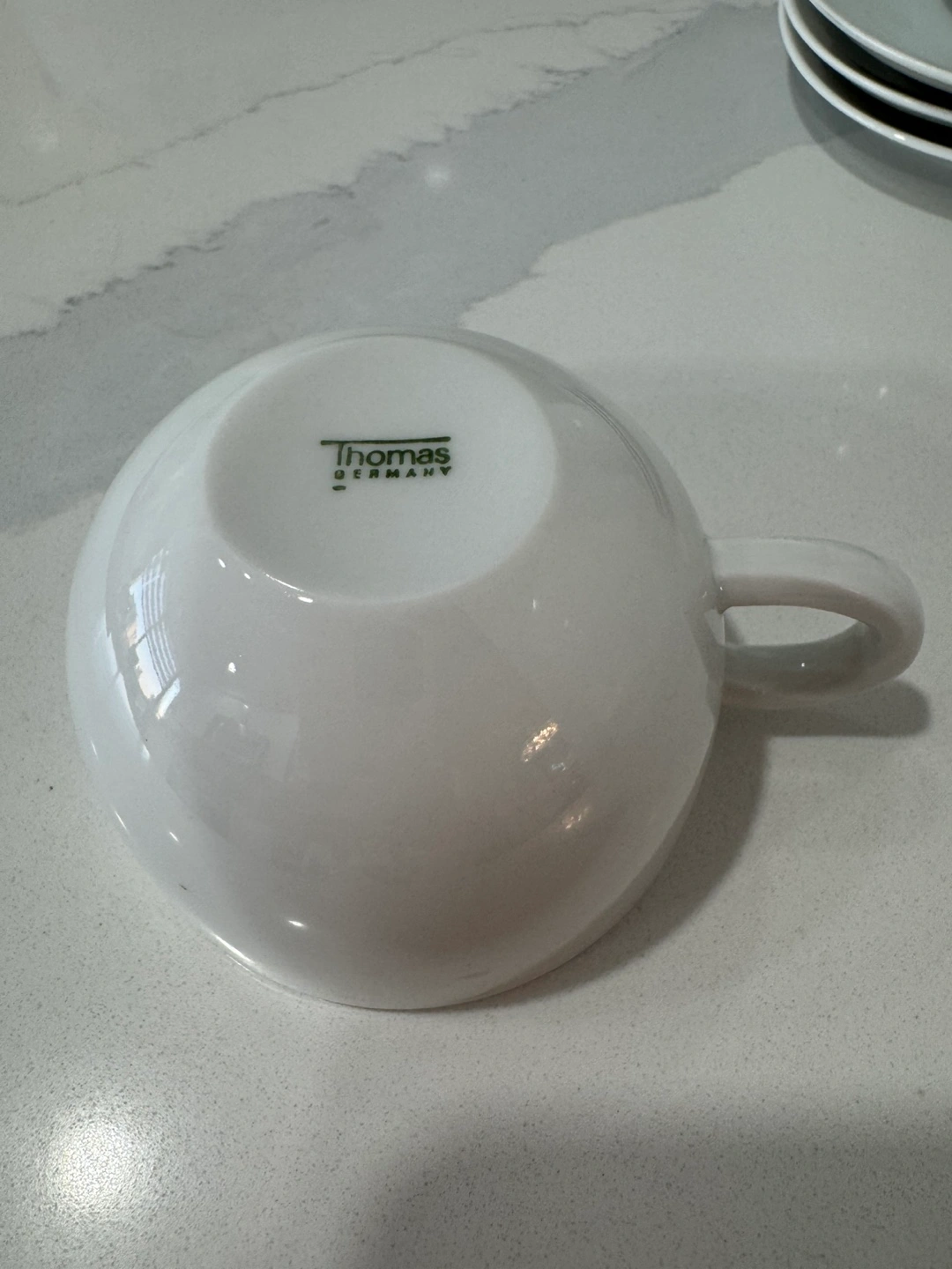 Vinrage cups and saucers from Thomas - Germany. Set of white coffee cups and saucers. The cups have a circular shape. The saucers have a flat surface. Perfect for relaxing with a soothing cup of tea. Pick up at Steeles & Bathurst