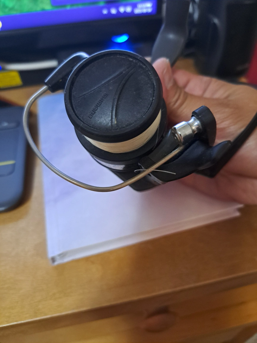 A used fishing reel. Features a silver wire and a black handle. It has the Shimano logo on the reel and on the side it reads AX2000 and R2000. You can go fishing, and feel the cool breeze and sunshine on your face while waiting for the fish to bite.