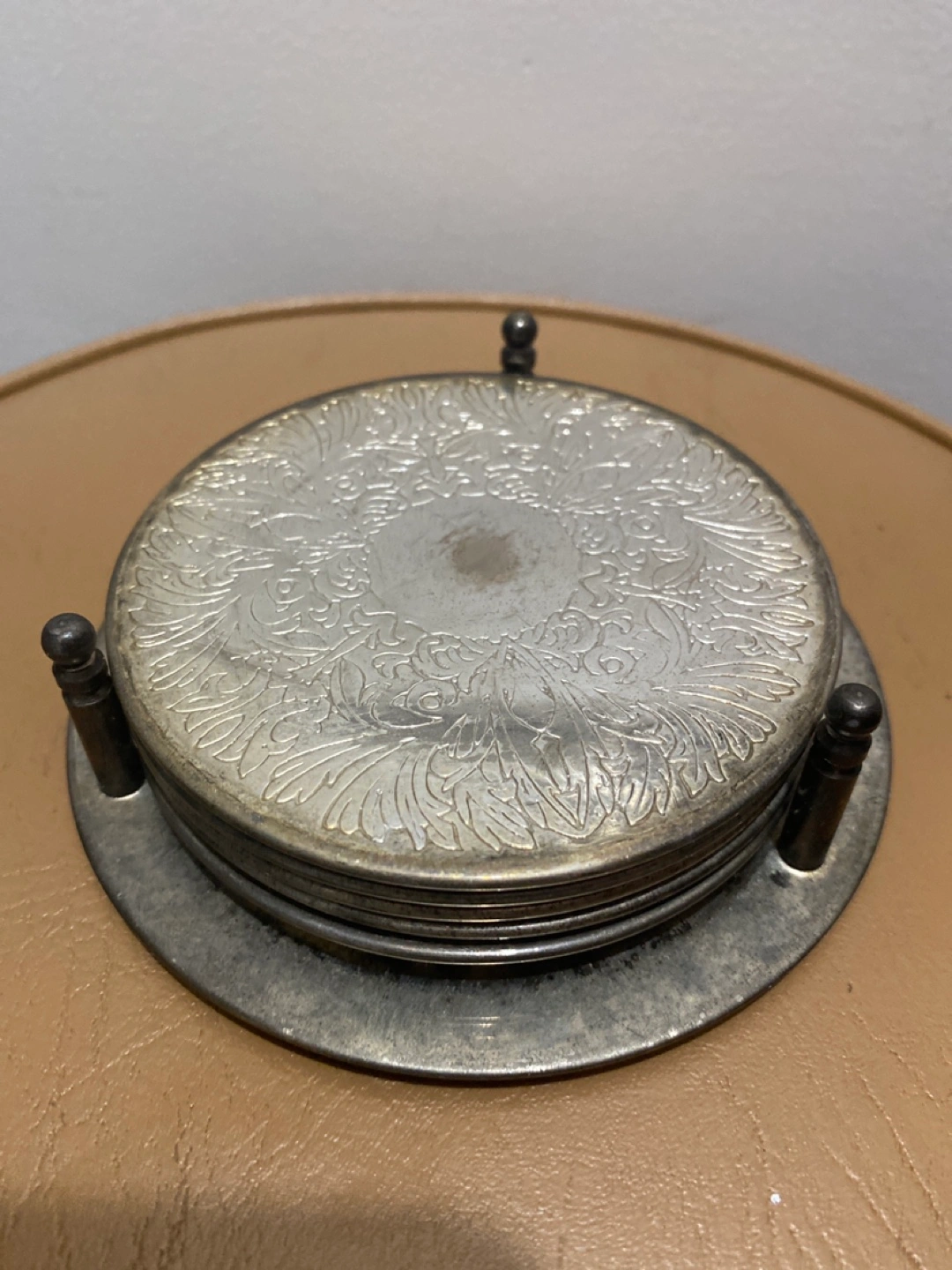 A set of silver coasters with a decorative floral design. Coasters are in a stand. The set could be a nice addition to any home, perfect for enjoying a quiet moment with a beverage.