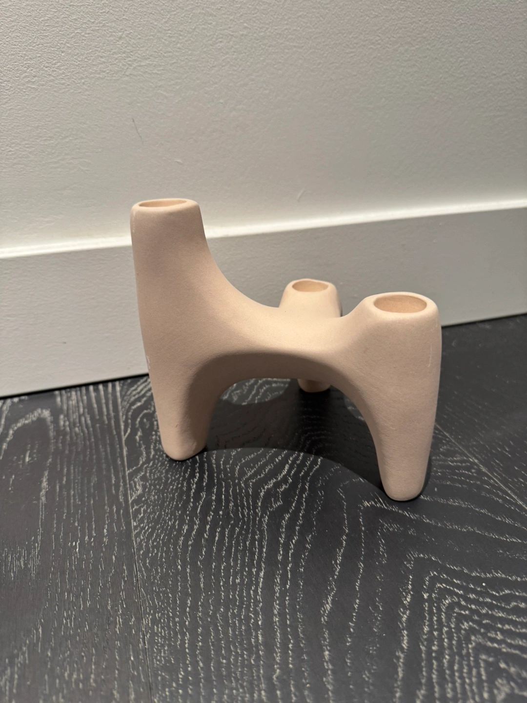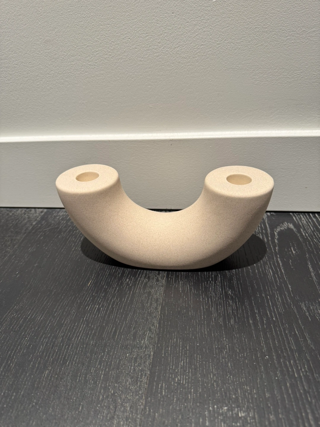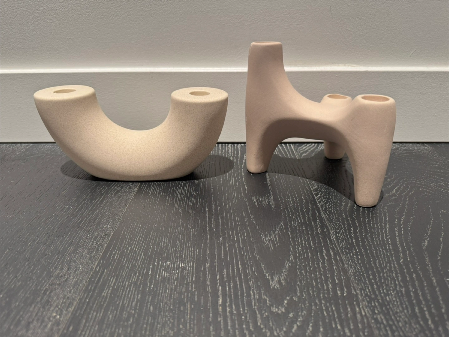 Selling a set of unique modern candle holders. They are both a beige colour. The first one has a U shape and the second one has an interesting structural shape. These candle holders would be perfect to set the mood for a relaxing evening.