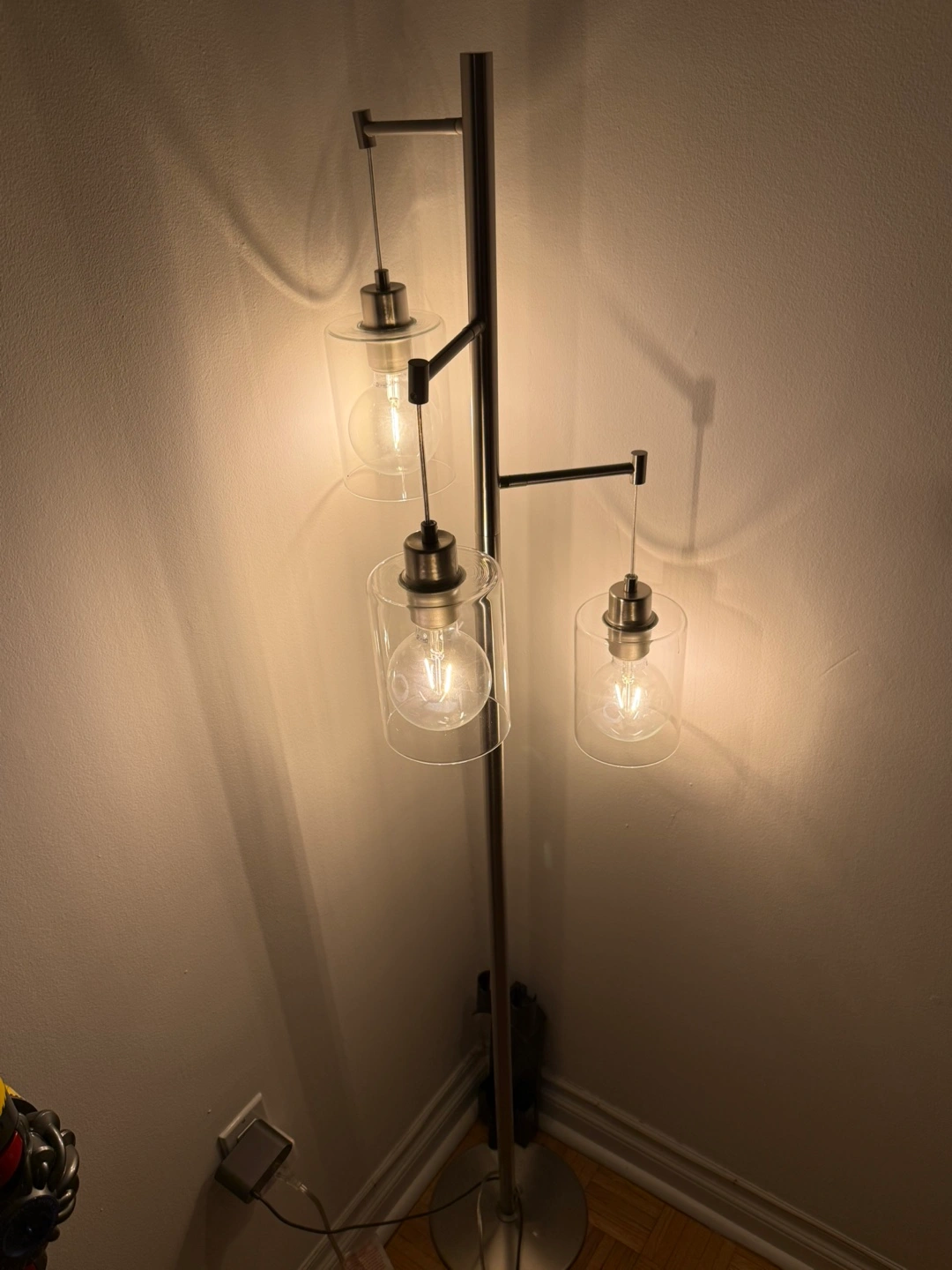 A sleek floor lamp. Stainless steel. Three glass shades, each holding a bulb.