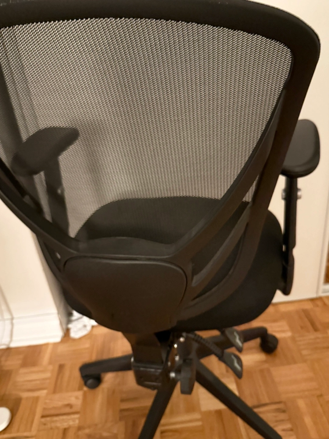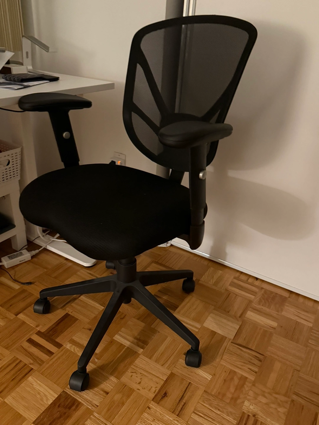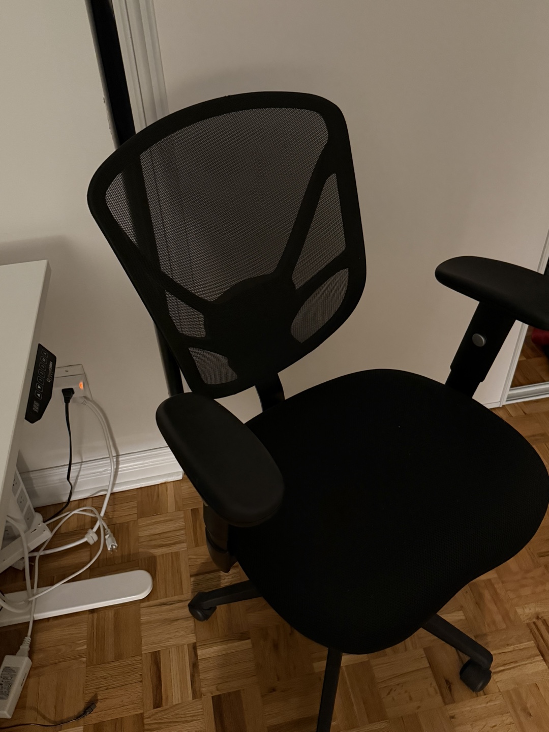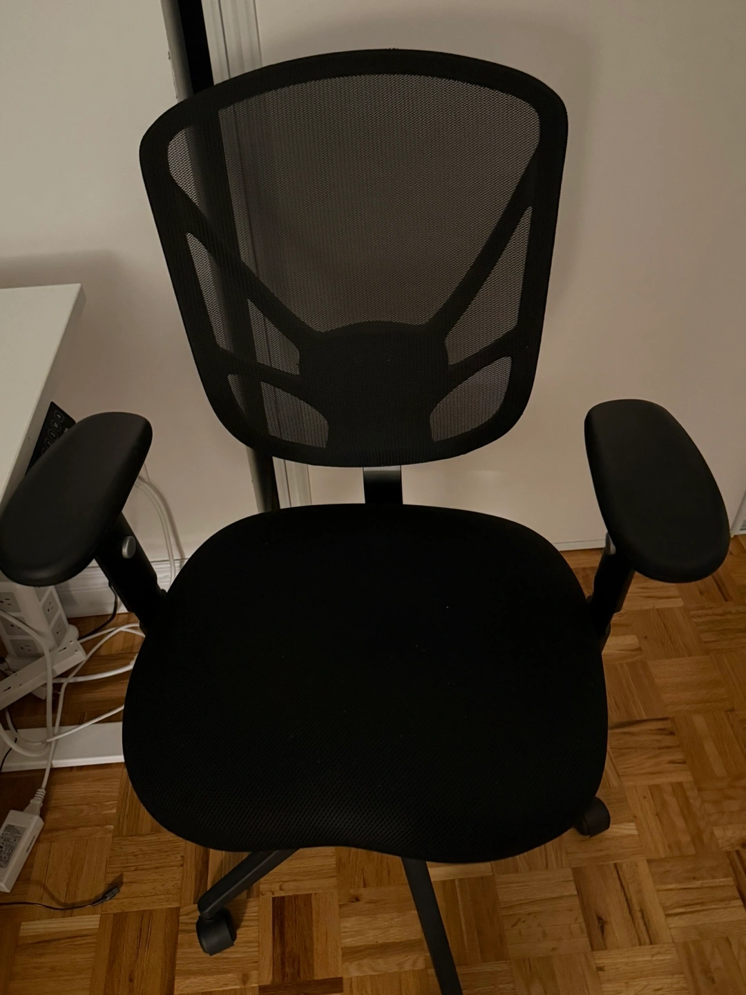 Black mesh back office chair. Cushioned seat. Adjustable armrests. Adjustable height and tilt controls. Perfect for long work sessions, this chair will provide you with the utmost comfort.