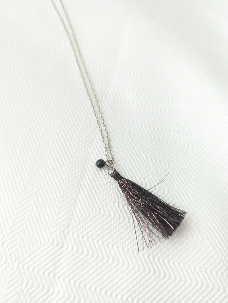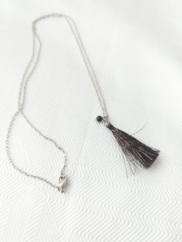 A simple silver-toned chain with a sparkly black tassel pendant and a small black bead above the tassel.