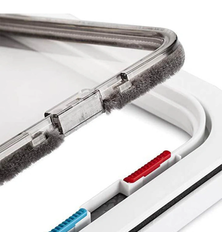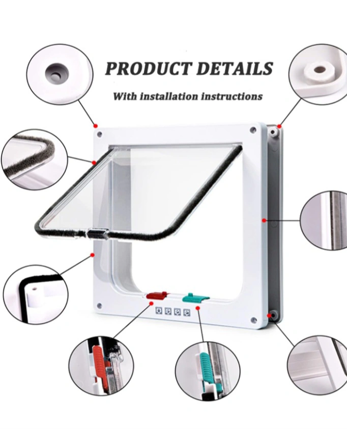 This pet door provides a convenient exit for your furry friend. It has a clear, hinged flap that is easy to open and close. It has a white plastic frame with lockable features. Perfect for cats and small dogs. XL
