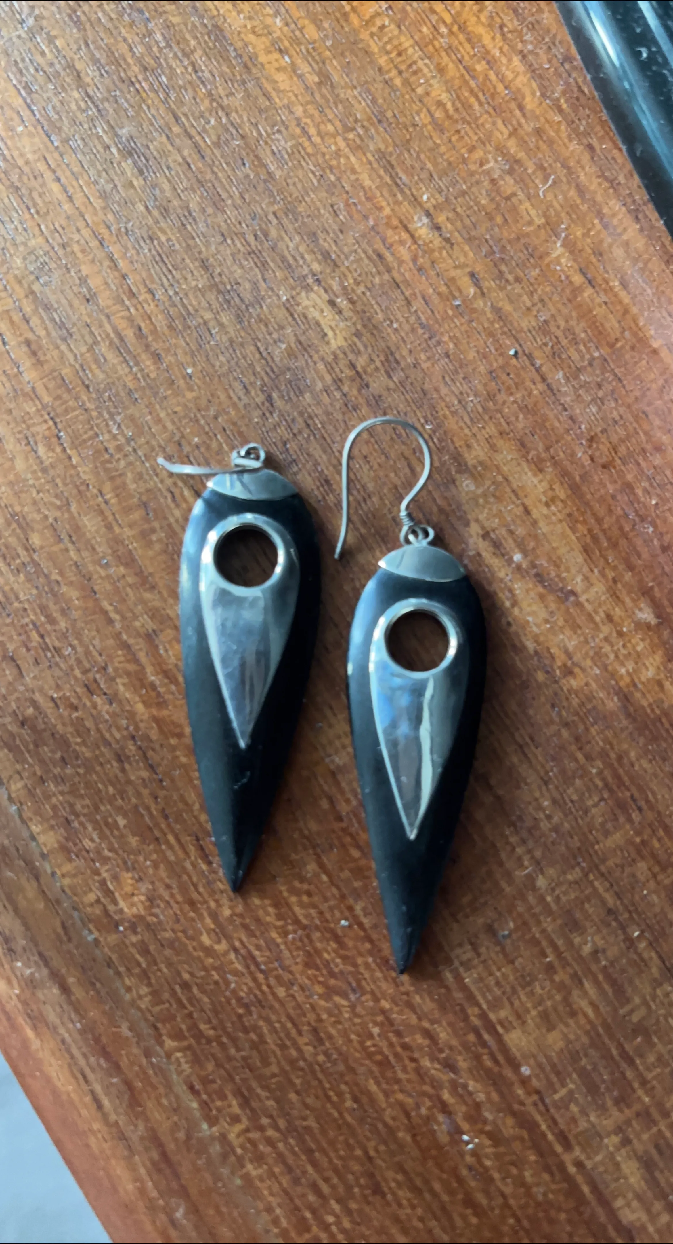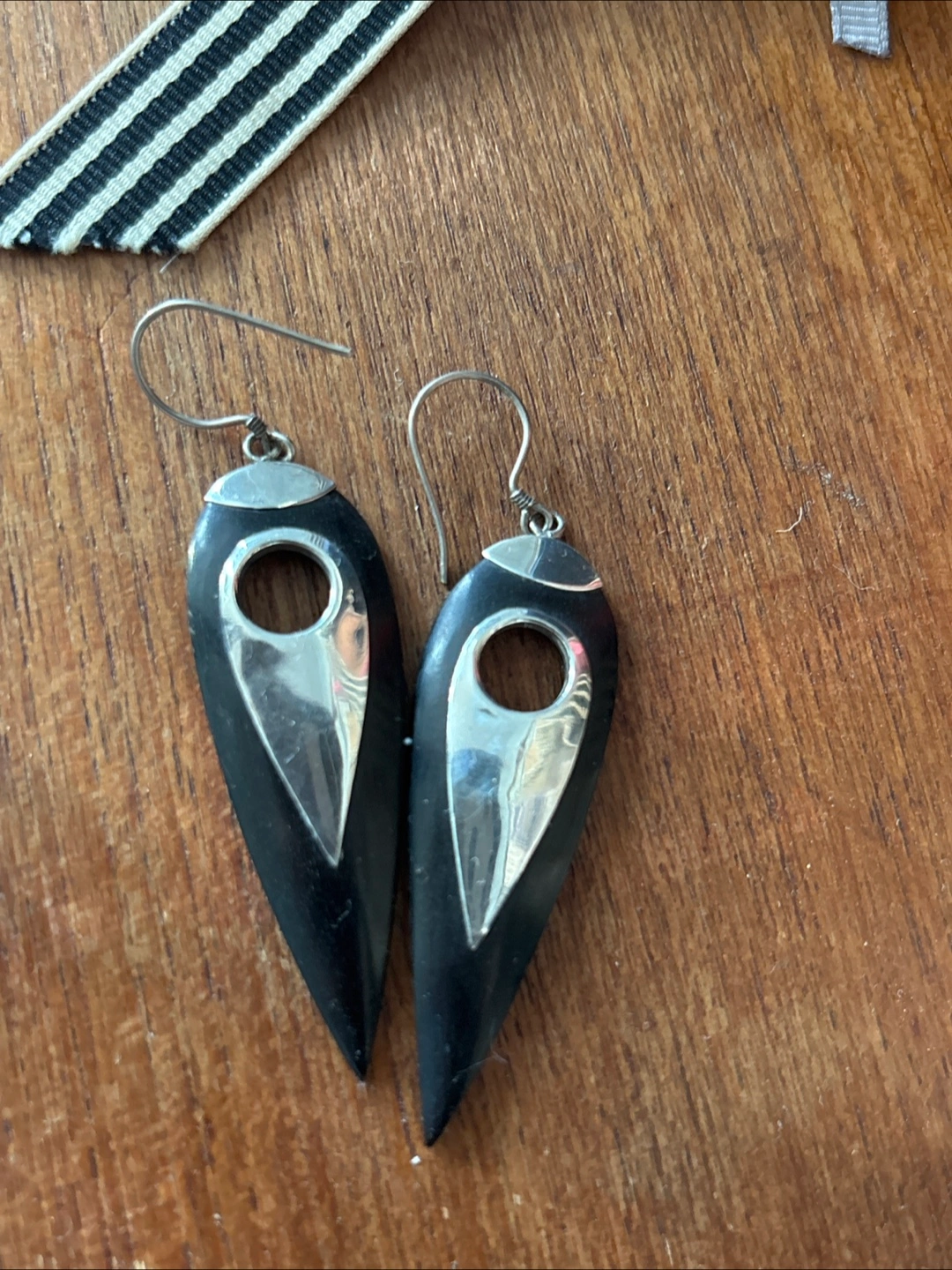These earrings feature a teardrop shape. Black and silver in colour. They have hook closures. Perfect to wear to a gathering, knowing you look great.