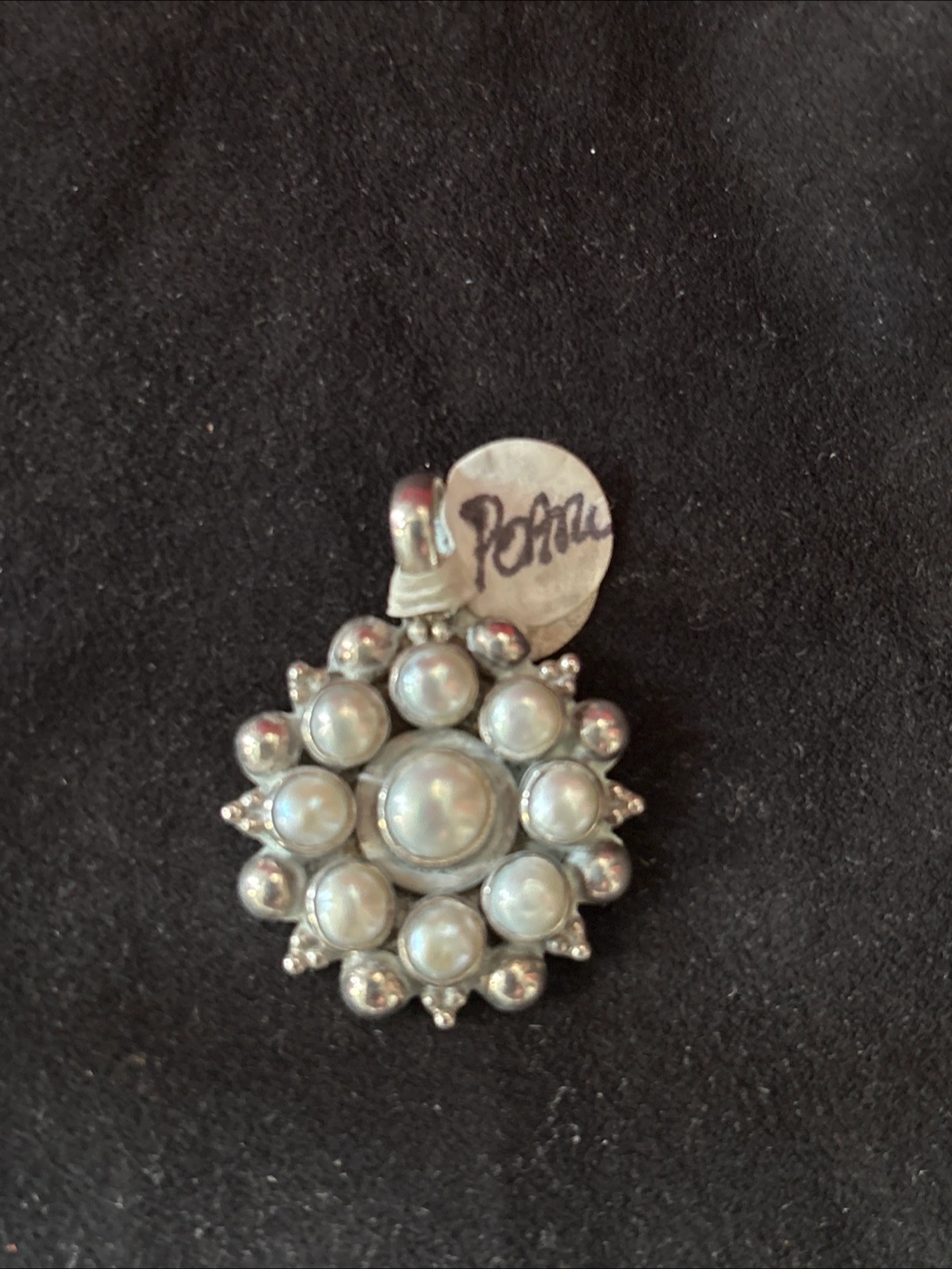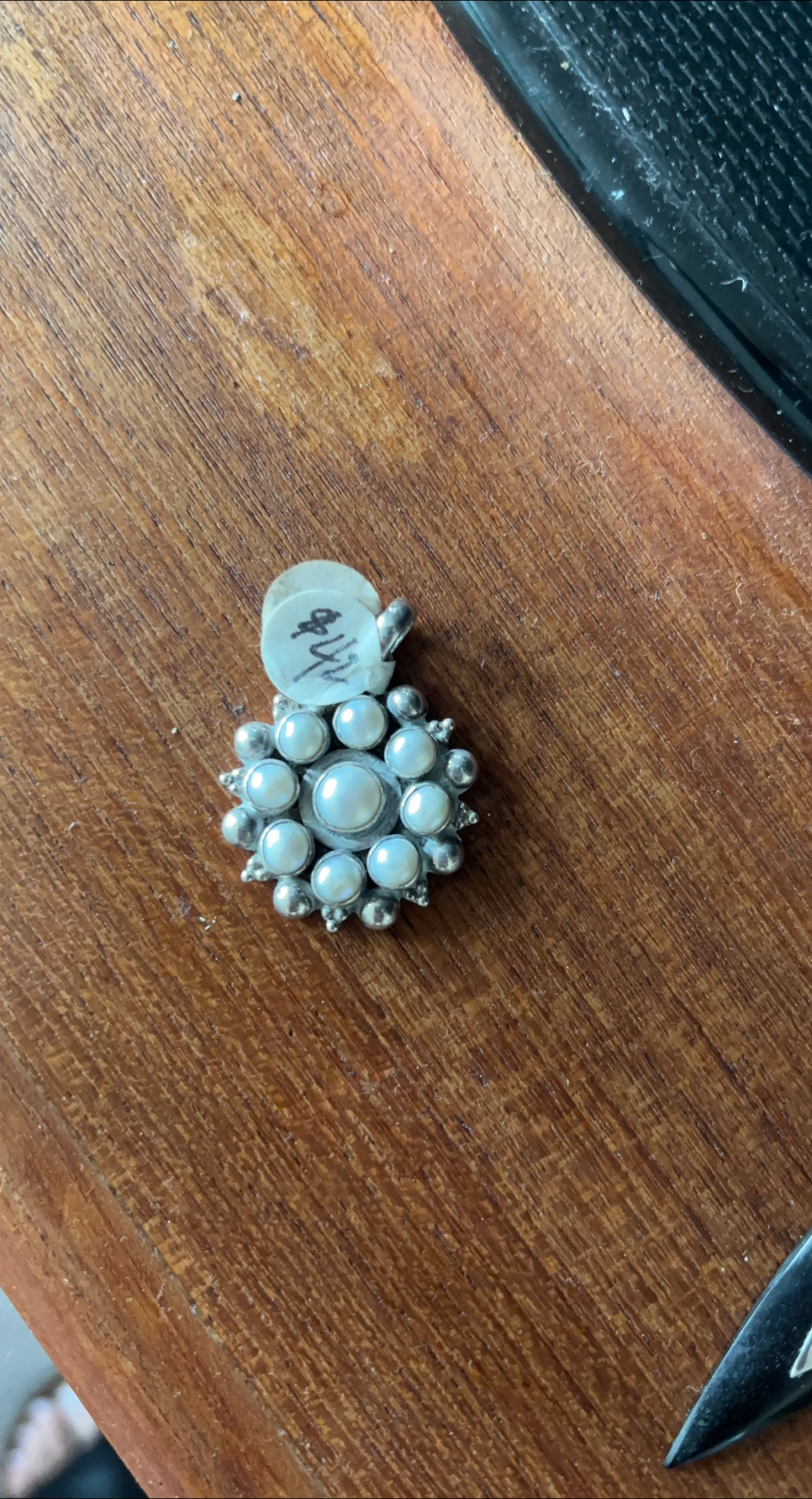 Beautiful mother of pearl pendant. 925 pendant is made of a silver and is circular in shape. There are several pearls attached to the design, creating a wonderful aesthetic for an elegant look.