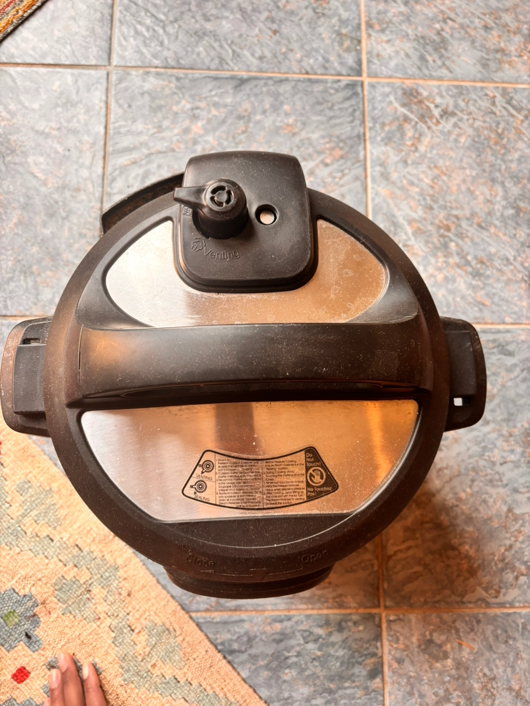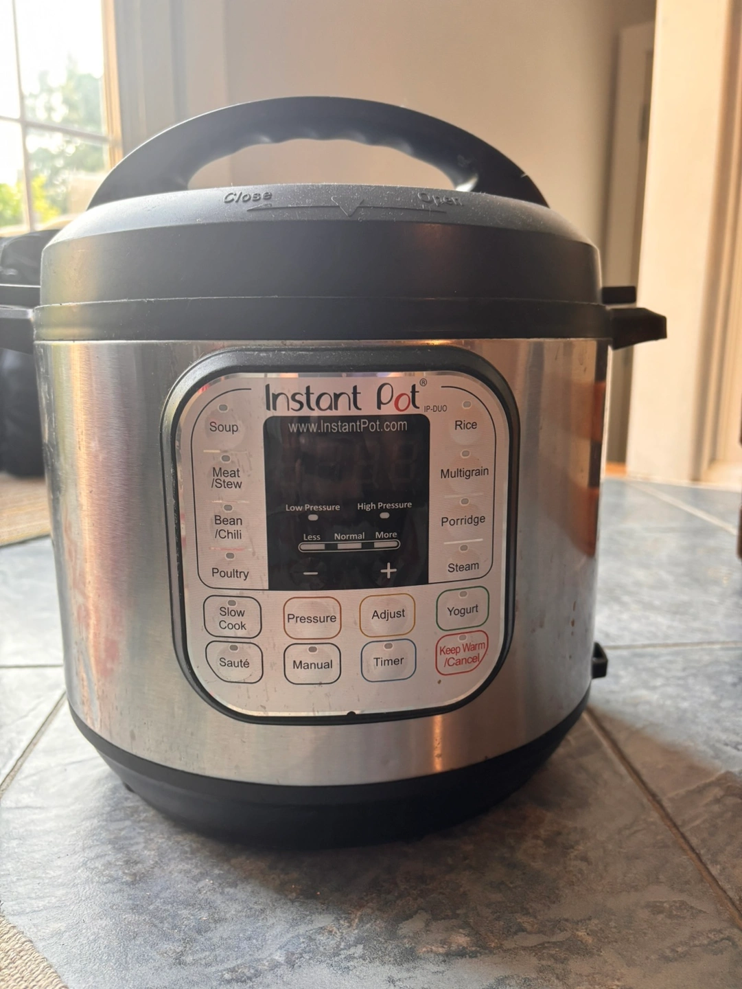An Instant Pot Duo pressure cooker. Constructed of stainless steel and black plastic. Features a control panel, lid, and handles. No additional manuals or accessories.