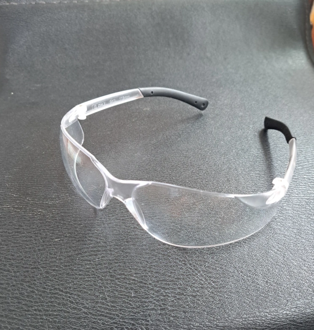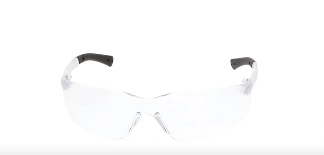 A pair of safety glasses with a clear lens. Features a wrap-around design with black arm tips for extra comfort. These glasses could be used to protect your eyes while working, but could also be used as a fashion accessory.