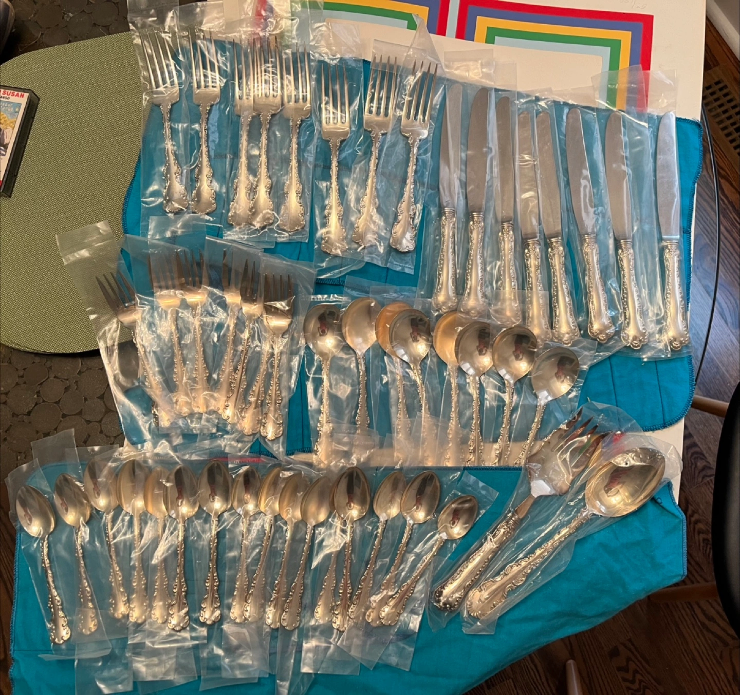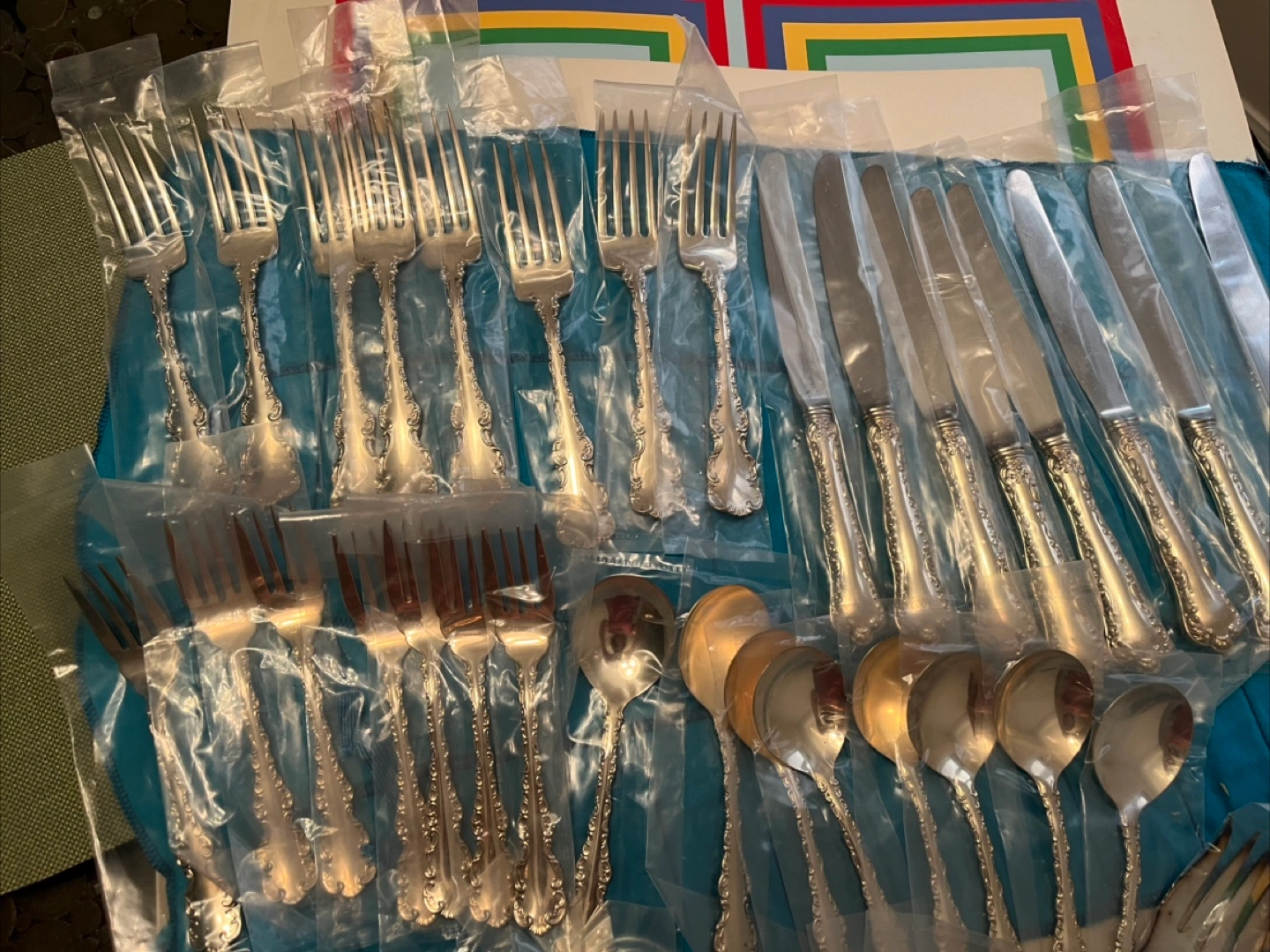 BRAND NEW!! Silverware service for 8 in original plastic packaging. Includes forks, spoons (16 tea spoons) knives, 2 larger serving pieces. It is a very nice set. I can't wait for you to use this during your next meal.