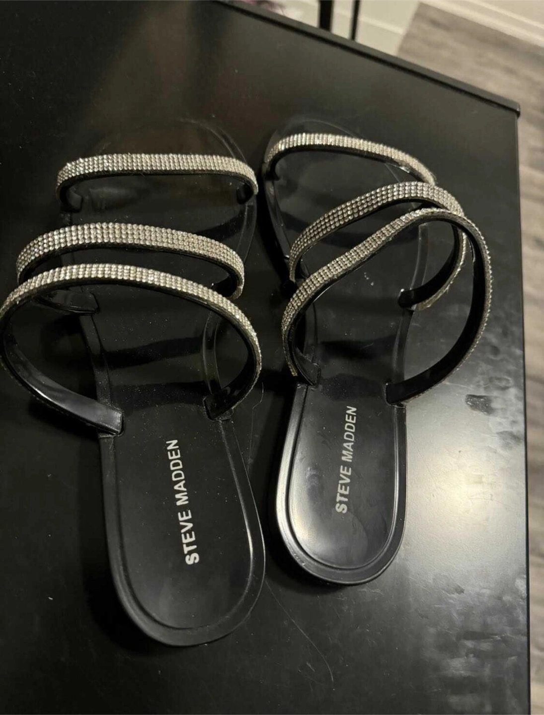 Black sandals featuring rhinestone straps. The sandals have a rubber sole. A perfect item for a relaxing day at the beach.