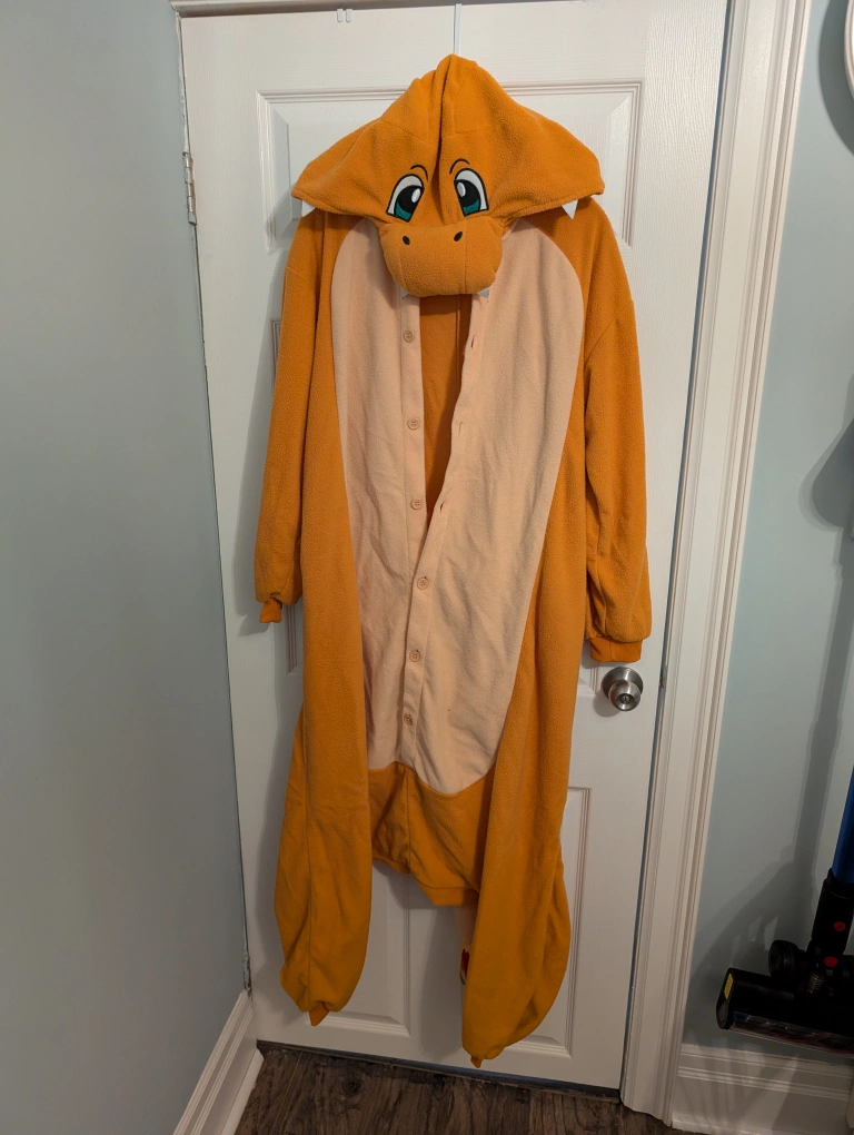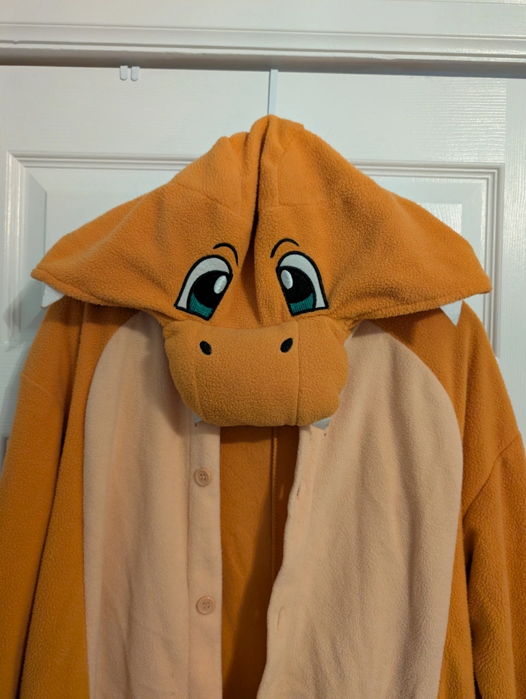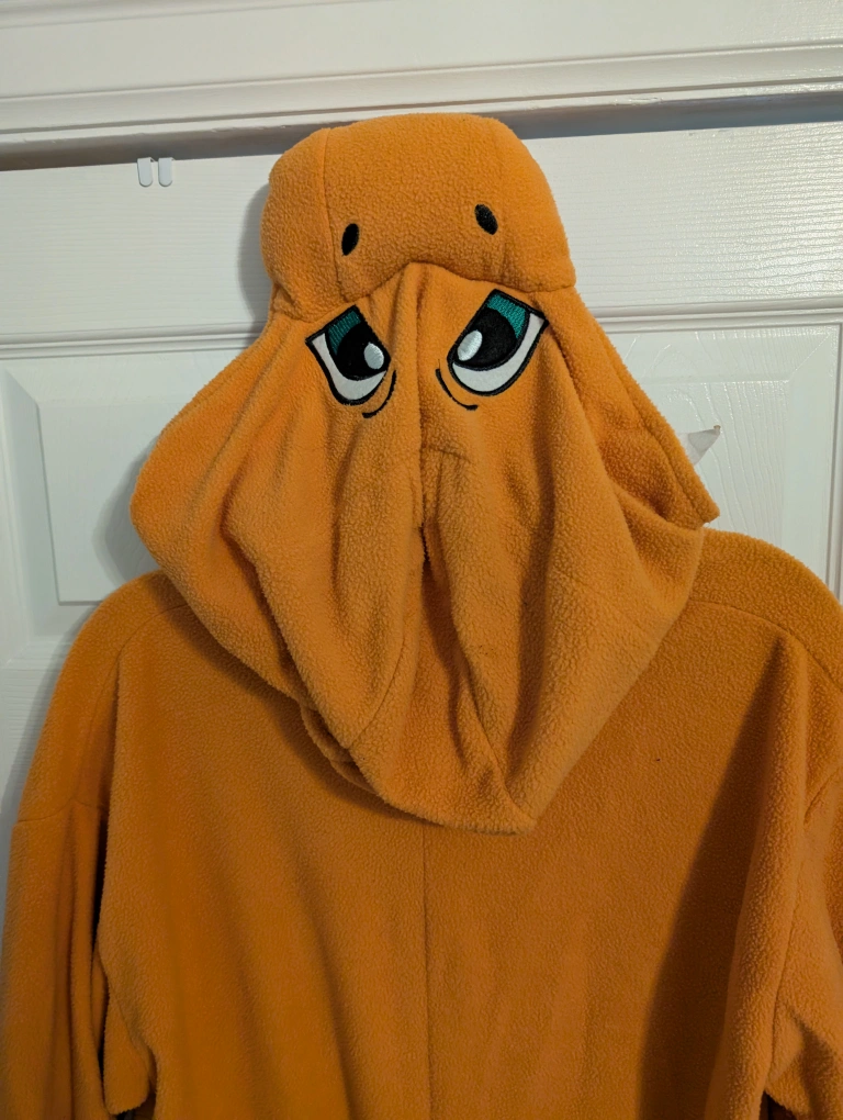 A vibrant orange Charmander onesie. Features a button-up front, a hood with character detailing and a fiery tail! Perfect for a cozy movie night or wandering around your house practicing your ember π₯π iykyk