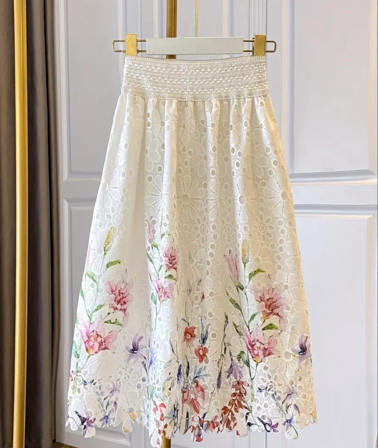 The white skirt is made of lace. Featuring a floral pattern. It will look lovely when worn in a sunny garden. The waistband looks to be elastic.