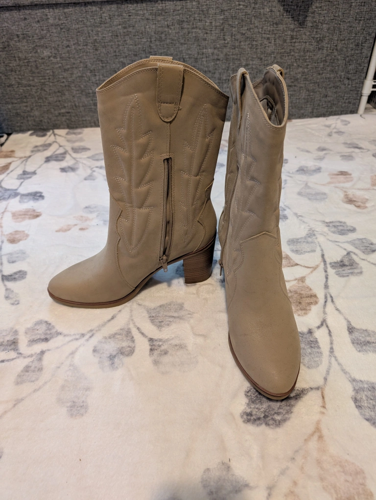 Taupe colored boots with western stitching and a zipper. They are perfect for those fall outfits!
