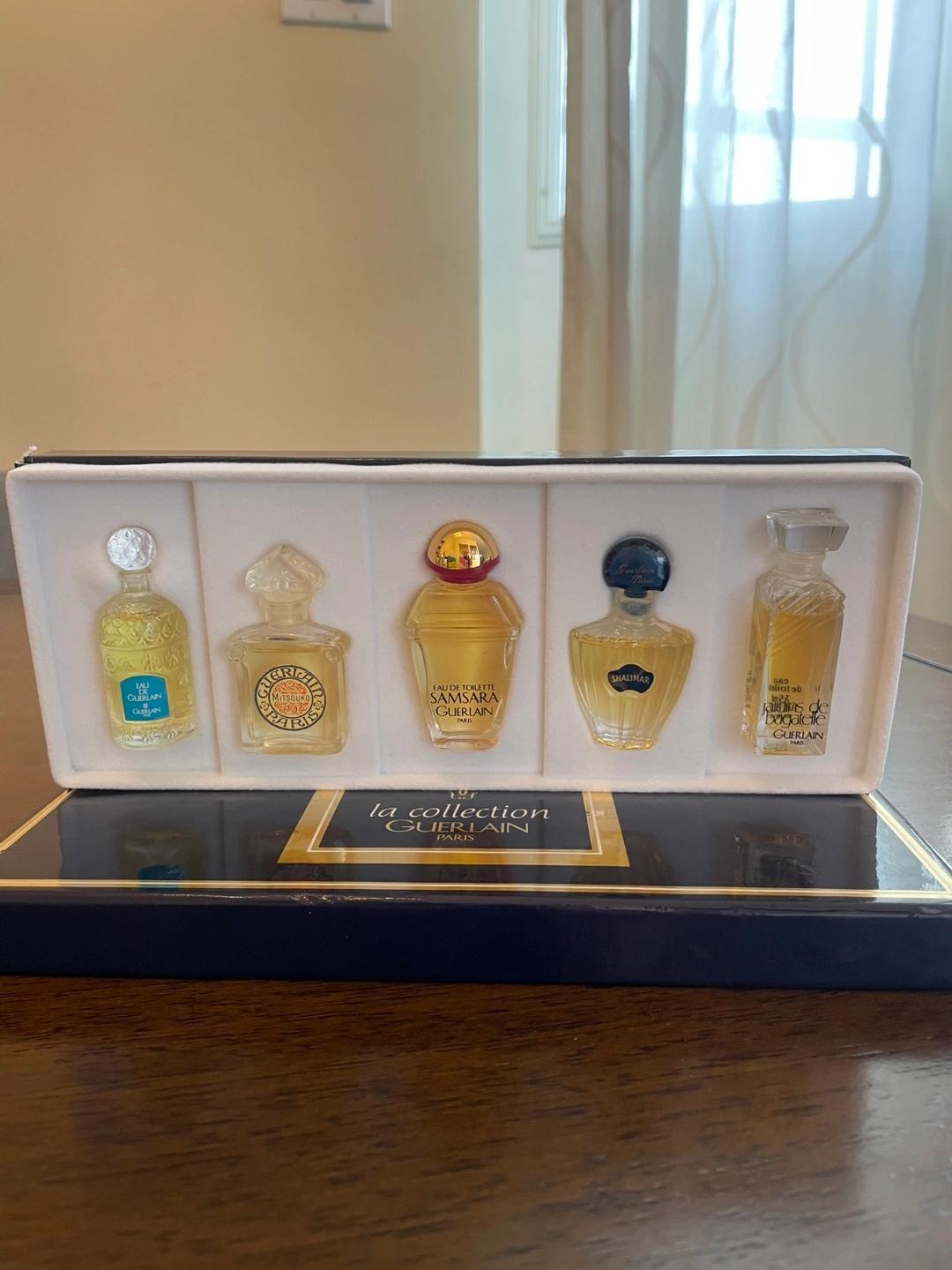 A Guerlain miniature perfume set. Each bottle has a different shape. It comes in a box with a magnetic closure. You can use this set to sample a variety of scents.
