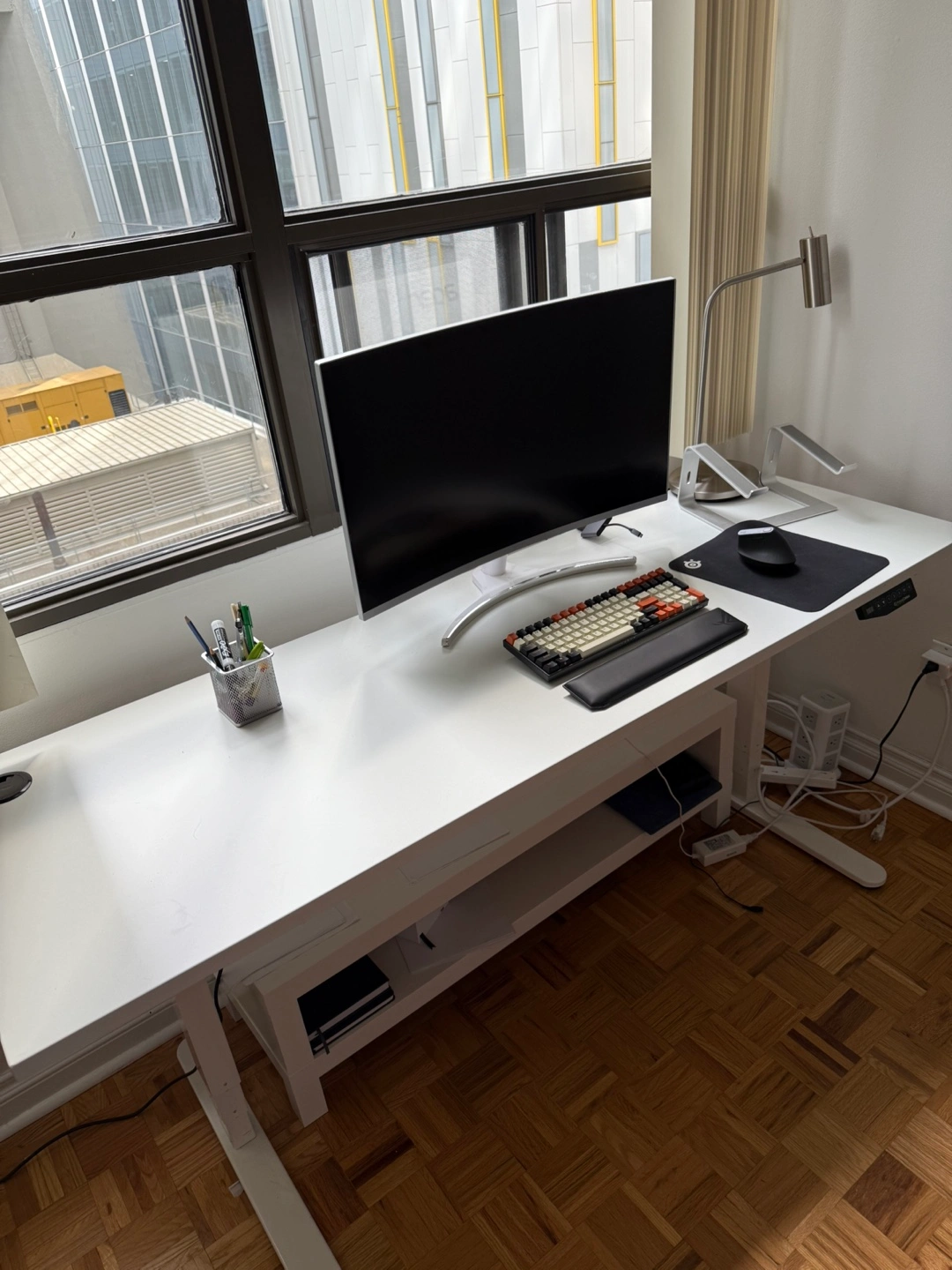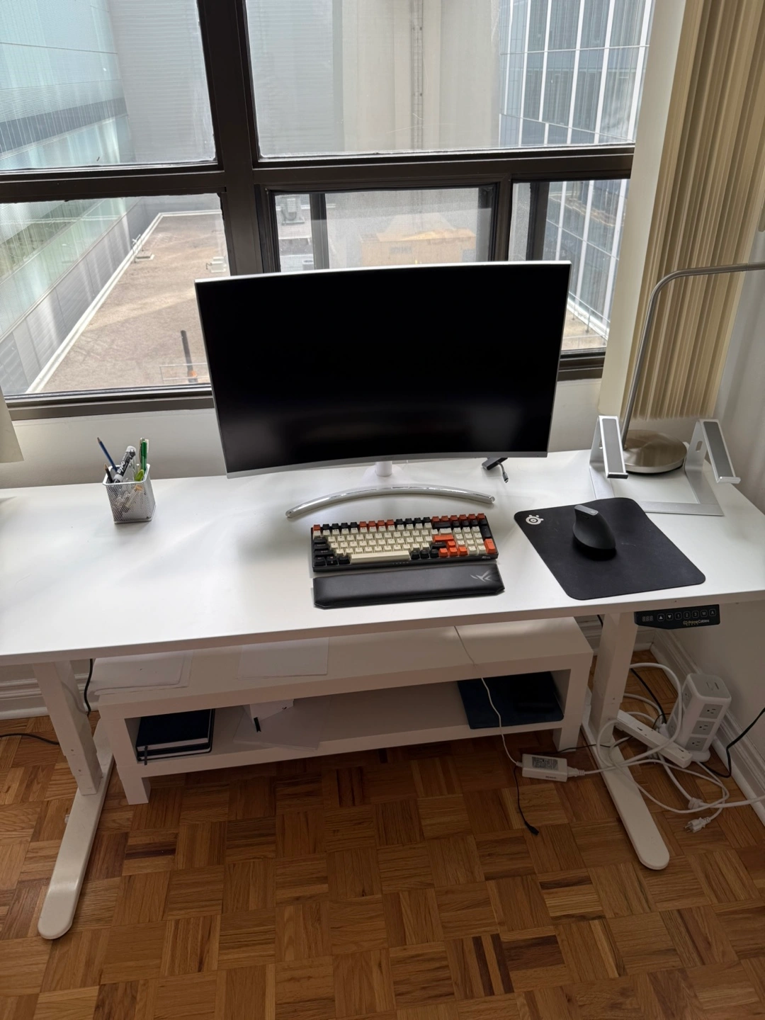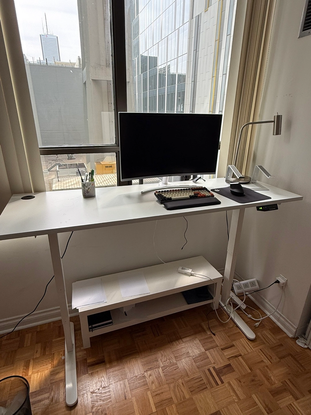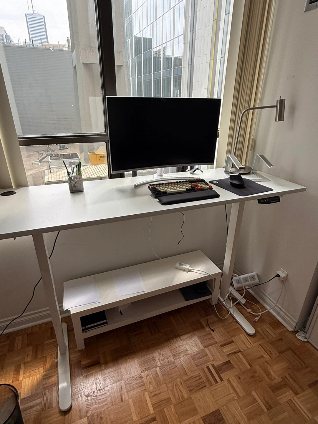 Solid white desk. Features an adjustable height. Comes with a lower shelf - for storage