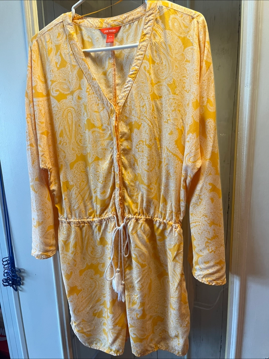 Romper with long sleeves and a tie around the waist. Bright orange colour with a white paisley print. A great piece for a summer day, it offers both comfort and style.