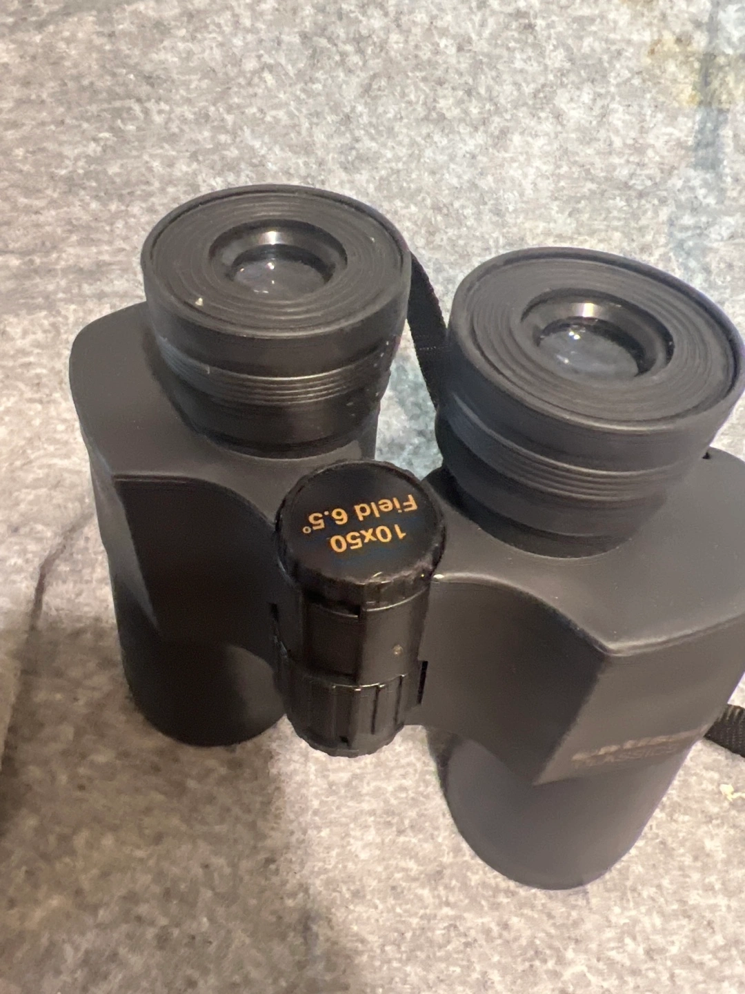 Black binoculars, complete with a case. Offers a field of 6.5 degrees, and magnification of 10x50. A perfect item to admire the natural world.