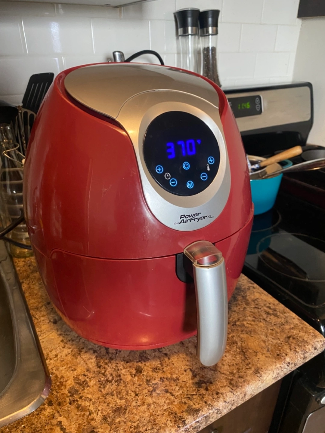 Red and silver coloured air fryer. Front handle with a digital screen on top. Pull-out basket. This air fryer will make delicious and crispy meals to help relax you after a long day.