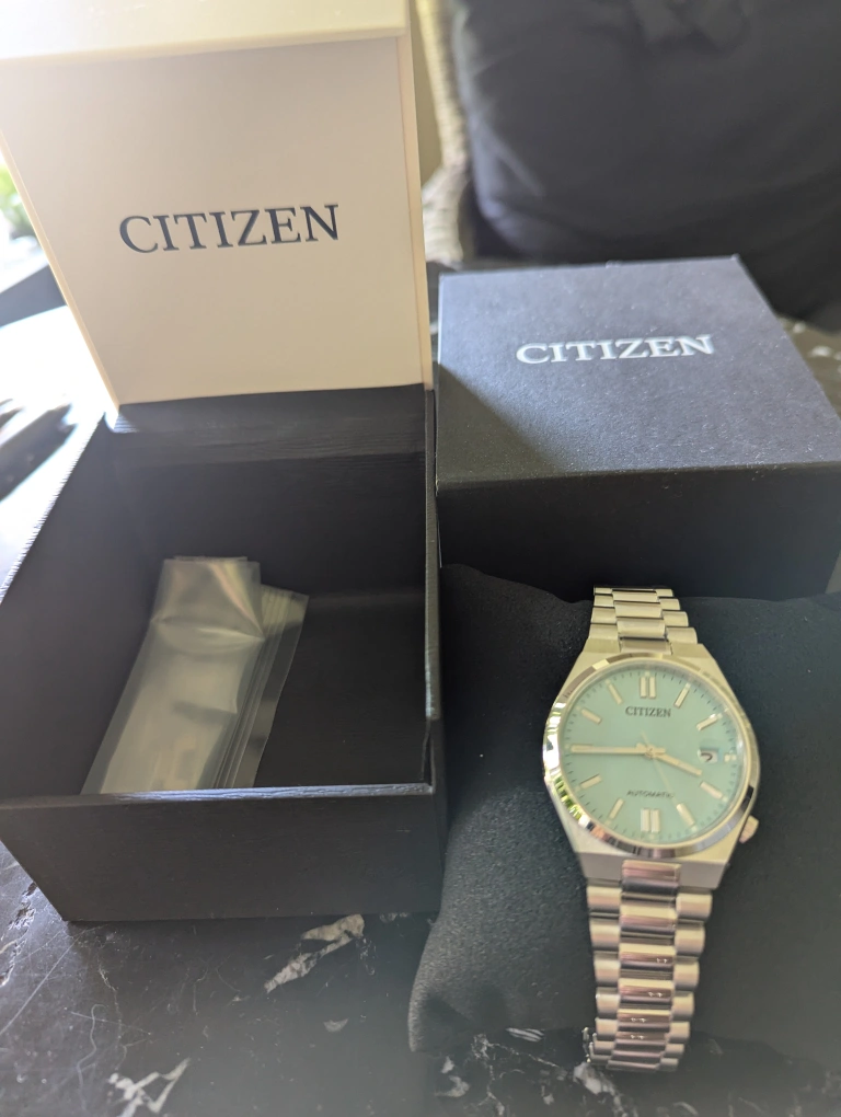 641Brand new Citizen Tsuyosa automatic men's watch, with the light blue dial, has extra links for the bracelet. This item lists at $595.00 plus taxes at retail.