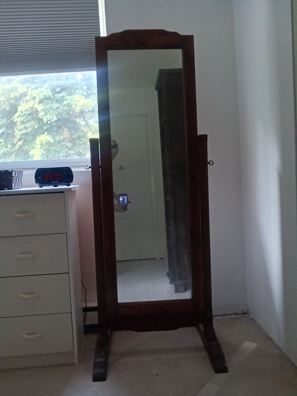 Standing wooden mirror. It has a dark brown frame. The mirror can tilt. Place it in your room to create a sense of serenity.