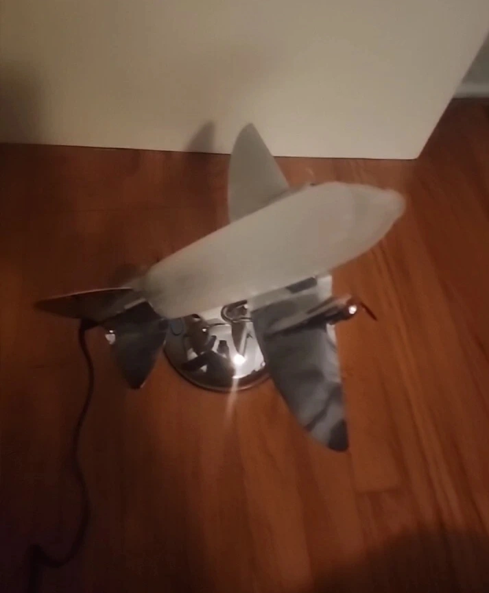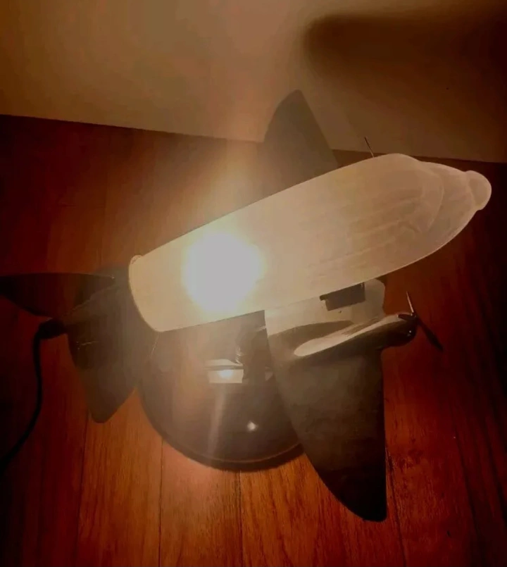 23vintage bomber lamp with a unique shape. Features a frosted shade. Looks like a propeller. Makes a wonderful addition to any room and will illuminate your space in a soft way.