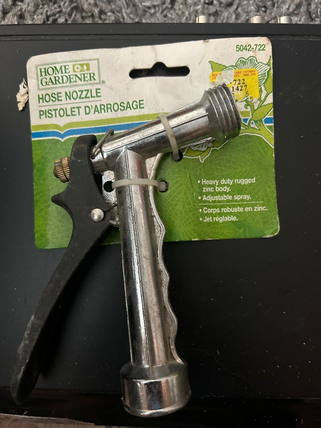 A hose nozzle, still attached to its original packaging. Featuring a black trigger and a chrome-like finish. It's perfect for watering plants; simply relax and let the water flow.