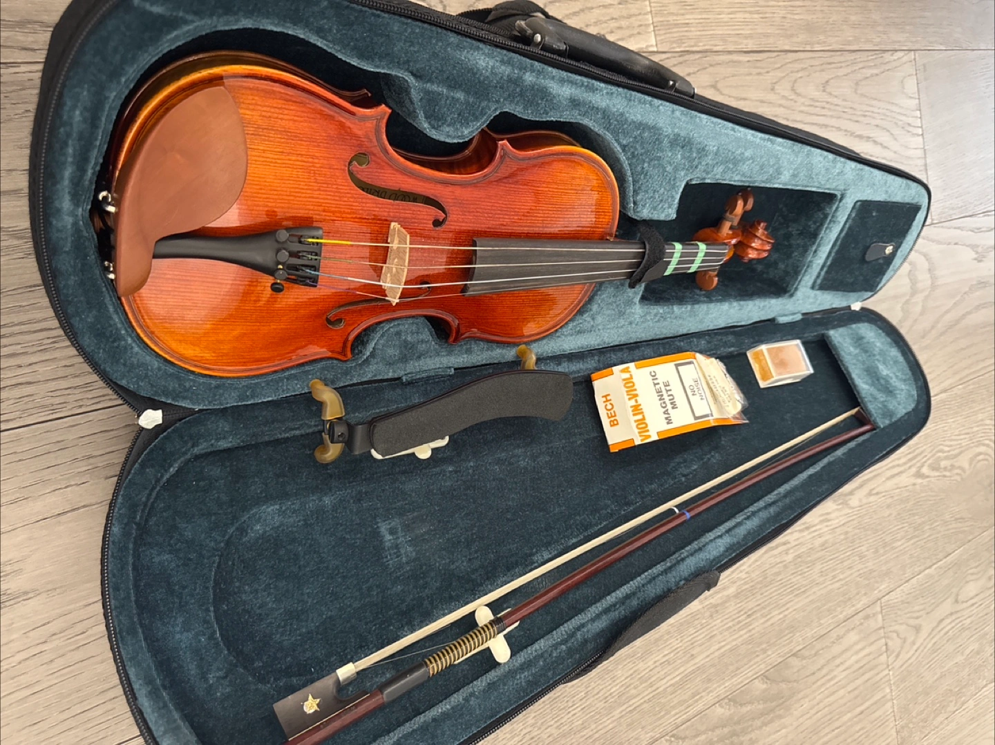 Comes with a case. Including a bow and a shoulder rest. Also includes a magnetic mute to reduce noise when playing, or for silent practice as well as a new resin.