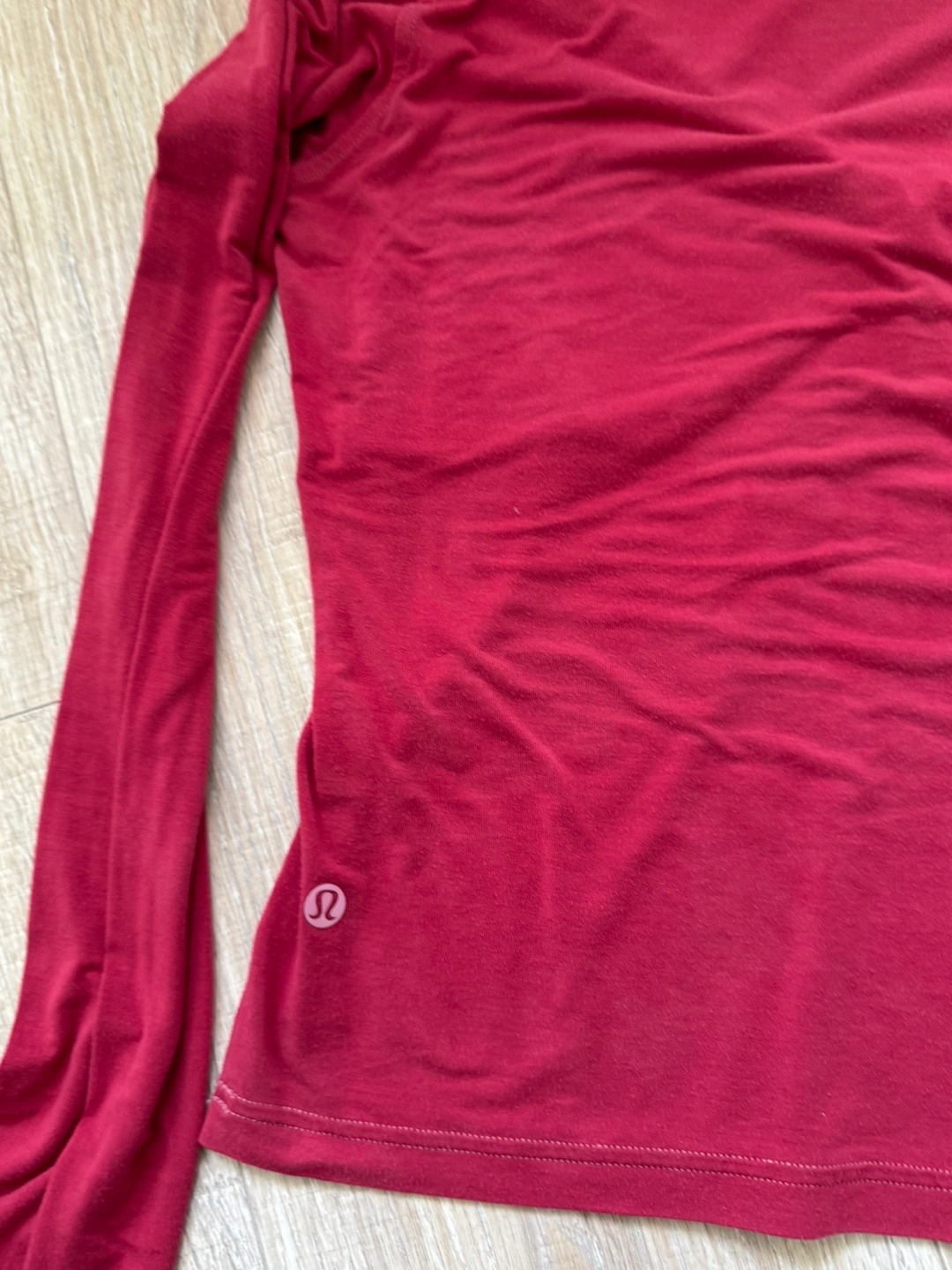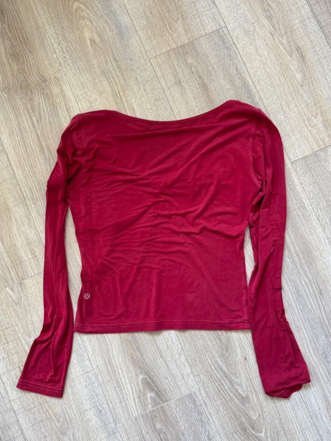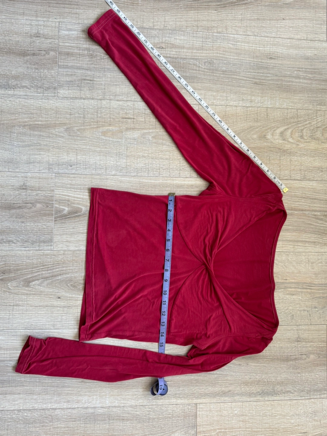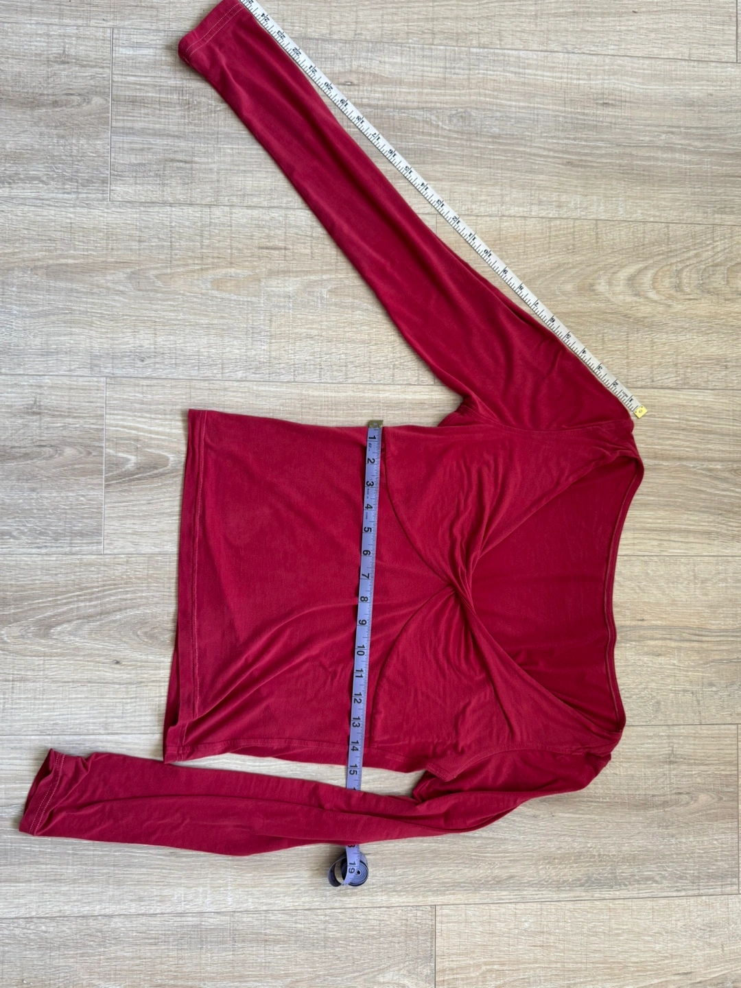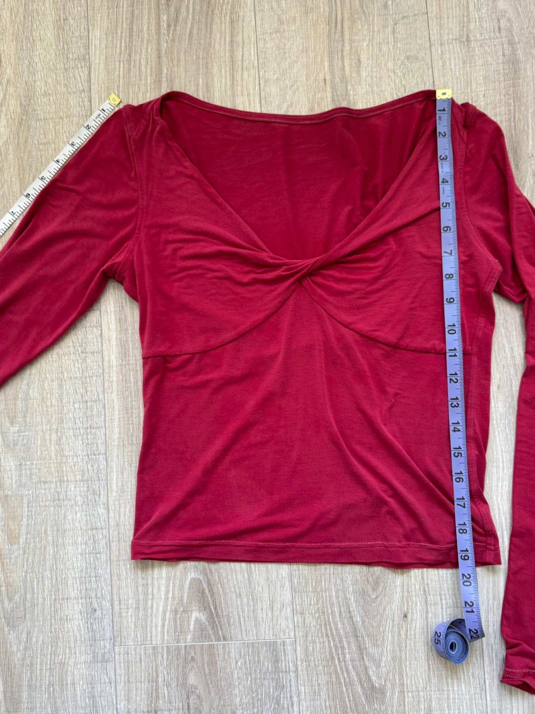 1000+A red long sleeve shirt, featuring a knot detail. Has a scoop neckline and long sleeves. Great for a yoga session or casual wear. Modal silk blend.