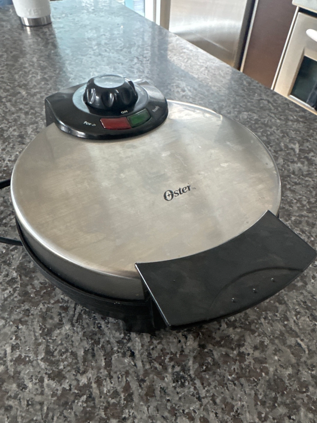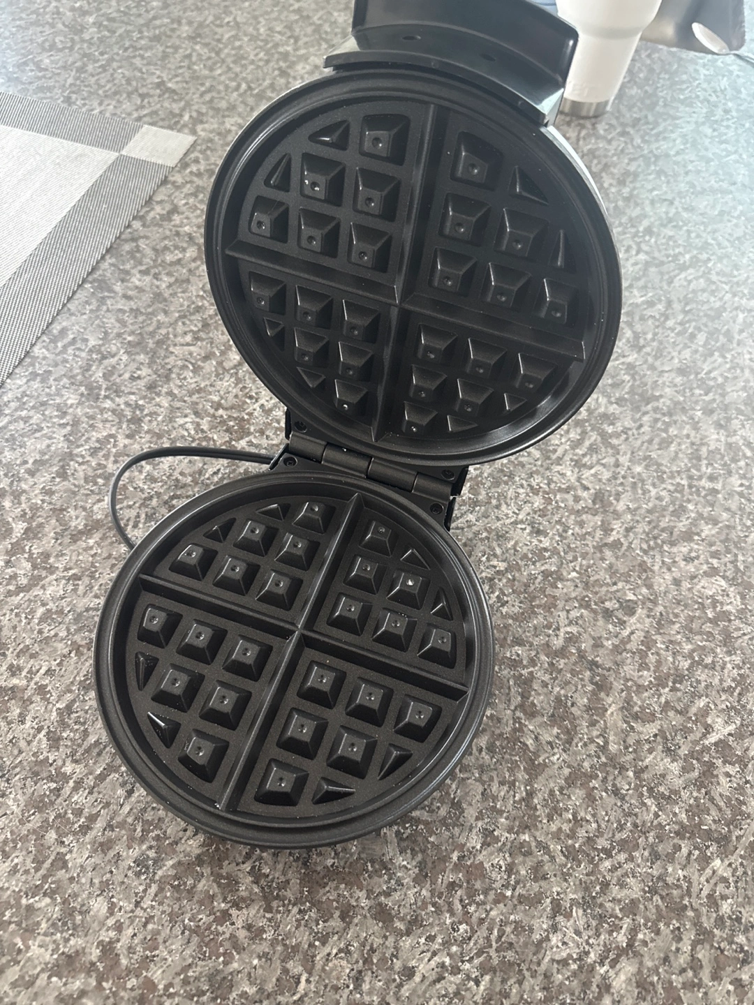 Round waffle maker. Made of stainless steel and black plastic. It includes a dial with a power indicator. Make your own waffles to treat yourself to something sweet and delicious, it is a great way to unwind.