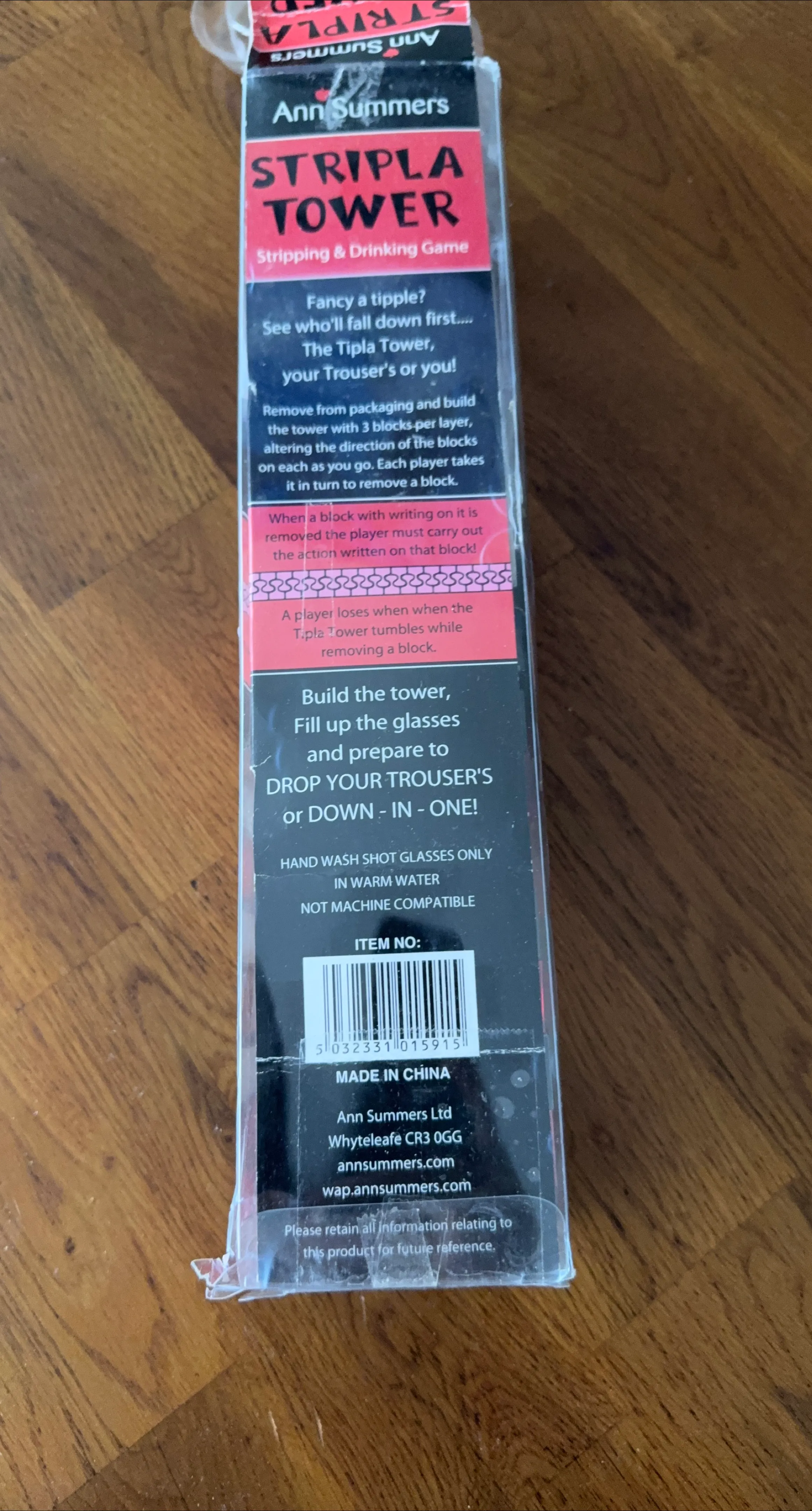 A fun adult game for the mature crowd. Includes the Stripla Tower blocks and 1 original shot glass. Instructions included on the box. A great way to relax and have fun with friends and family. 2 extra bridesmaid shot glasses. Cash and pick up. C2