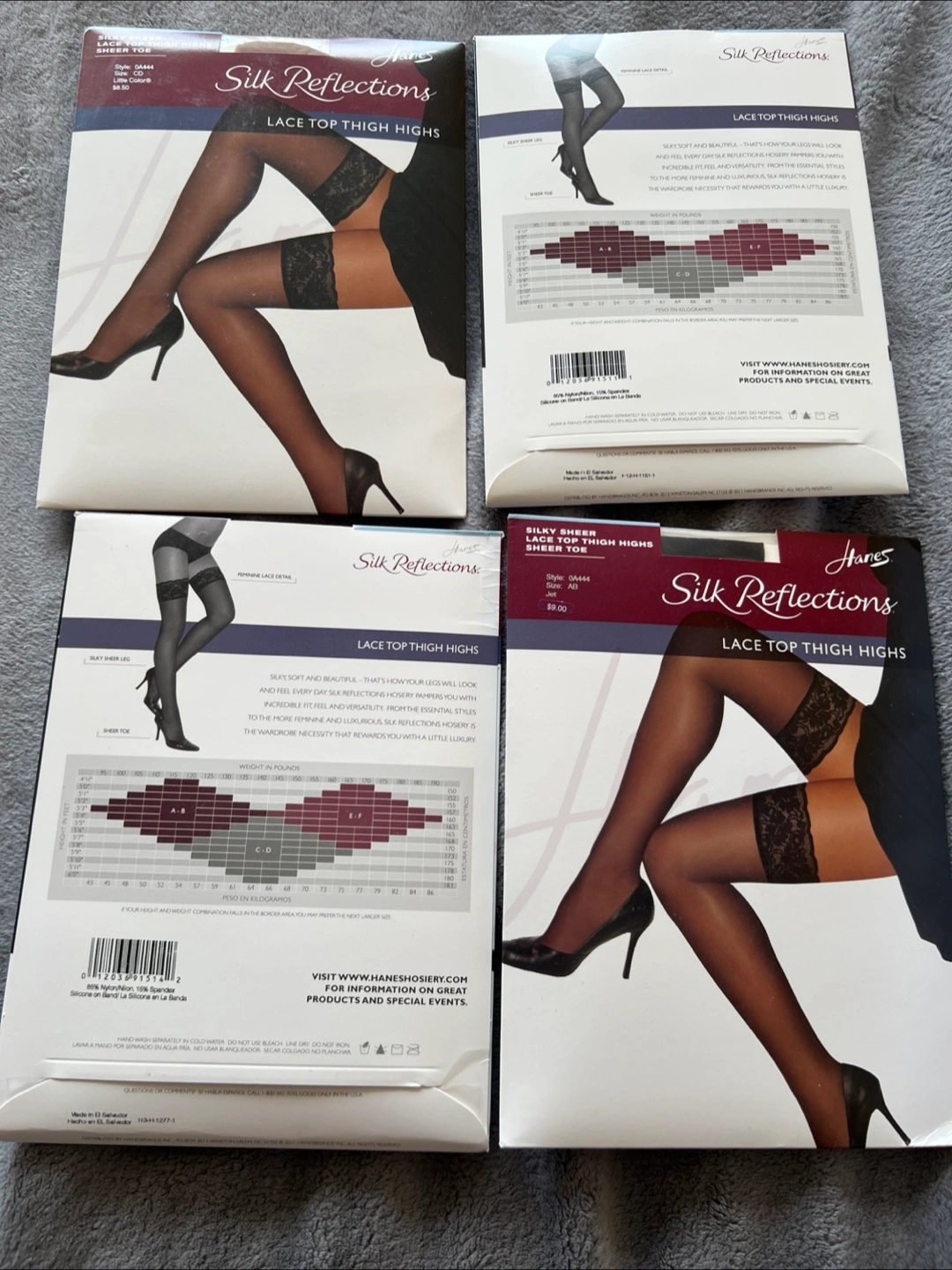 These Hanes thigh highs feature a sheer design and a lace top. Most are Jet black and some are little colour beige. AB size is good for 95-135 pounds weight.