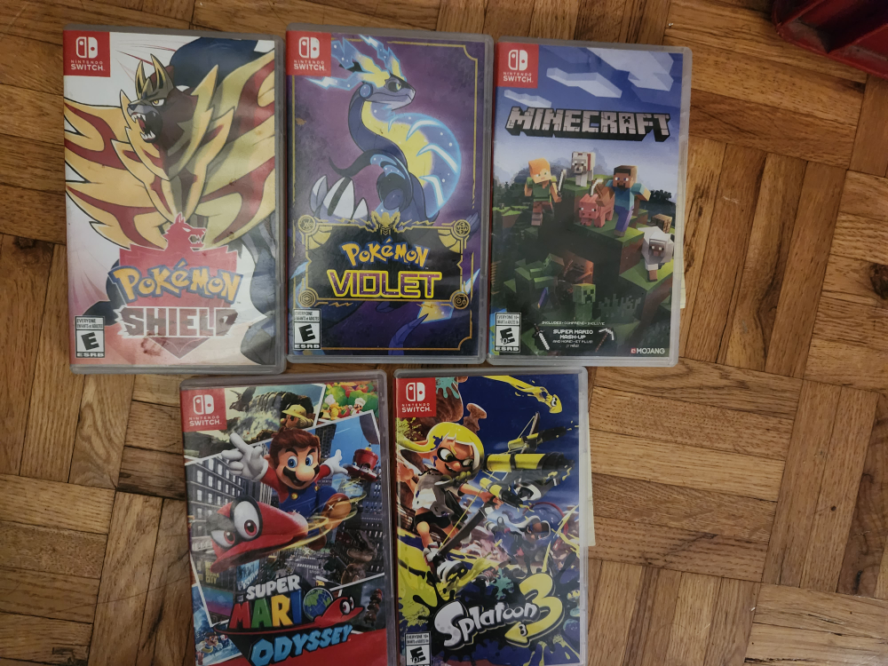 Super Mario Odyssey, Splatoon 3, Minecraft, Pokémon Shield and Pokémon Violet for Nintendo Switch. $40 each. Good working condition.