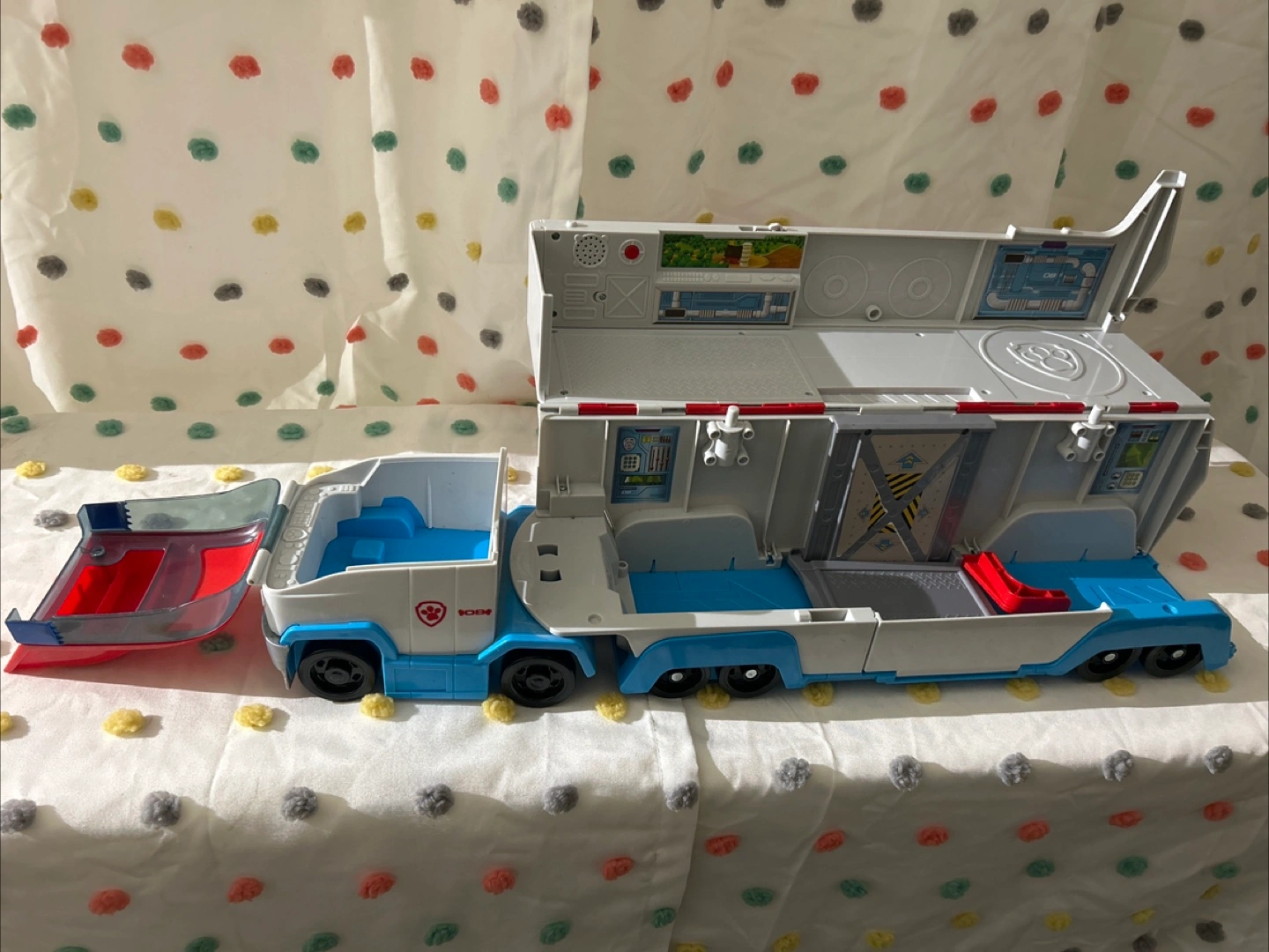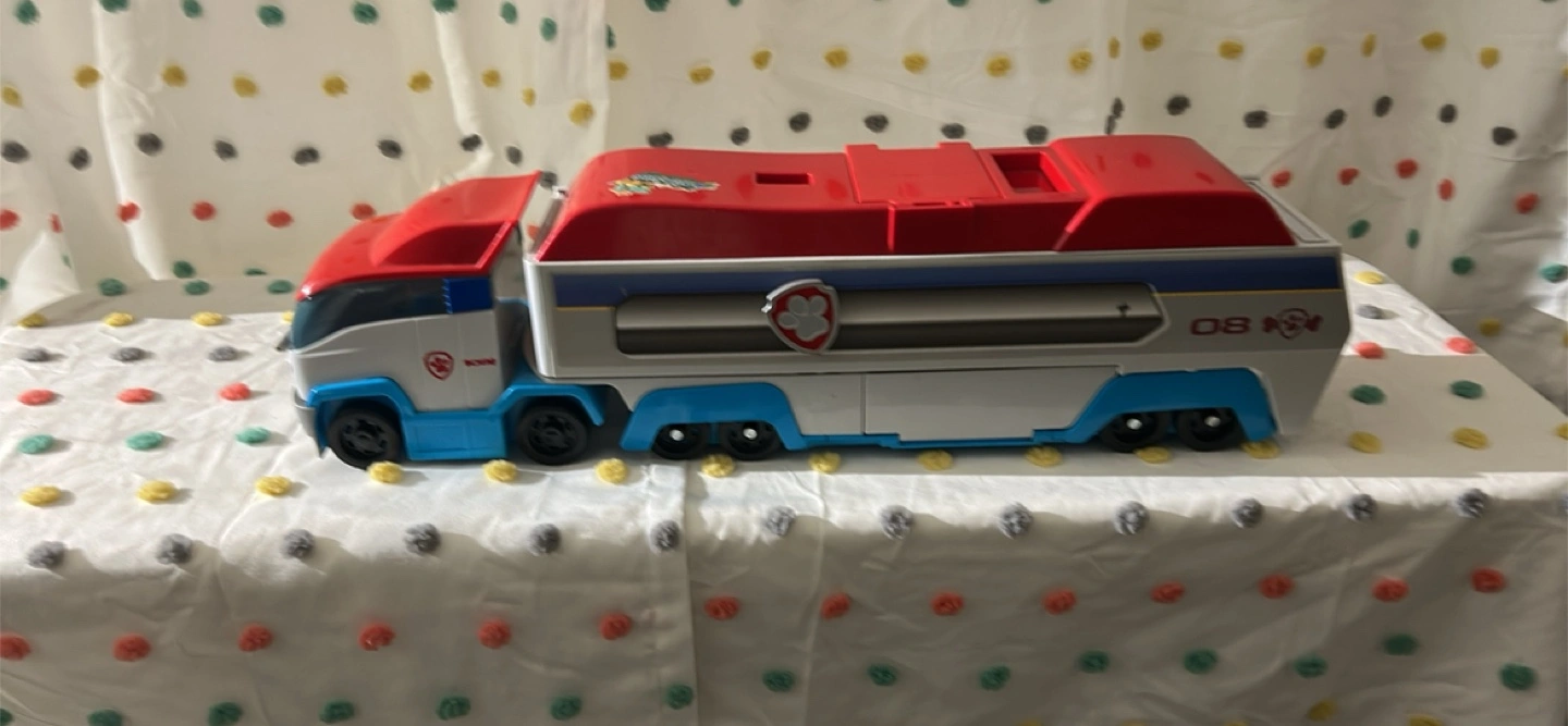 A toy transport truck. Features red and grey accents. Perfect for your little one to let their imagination run wild.
