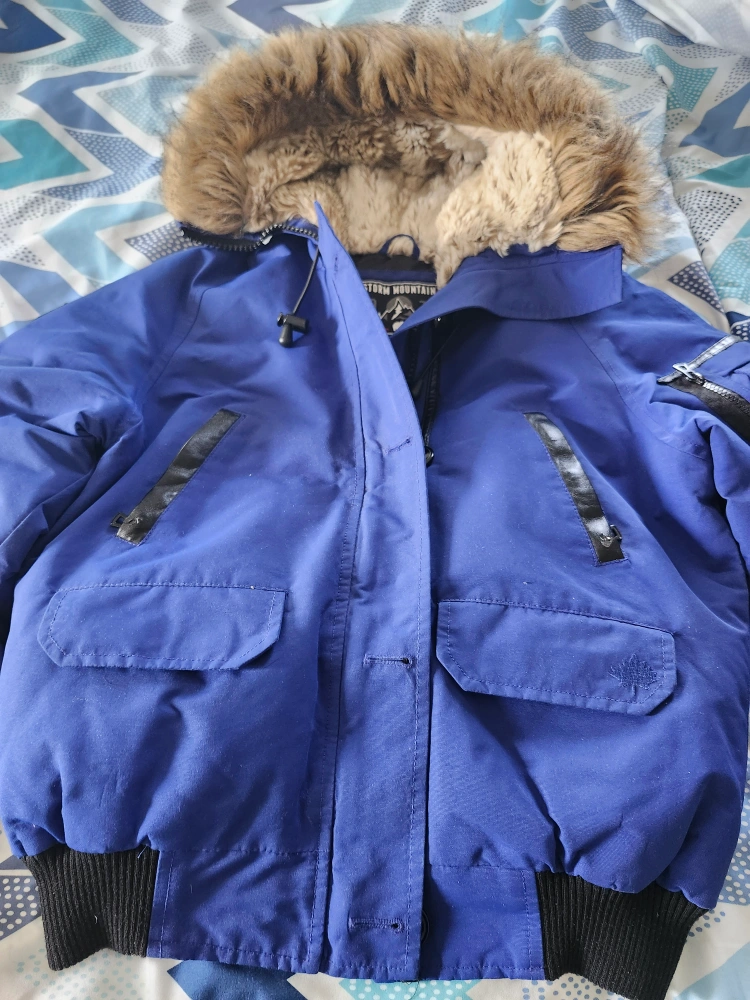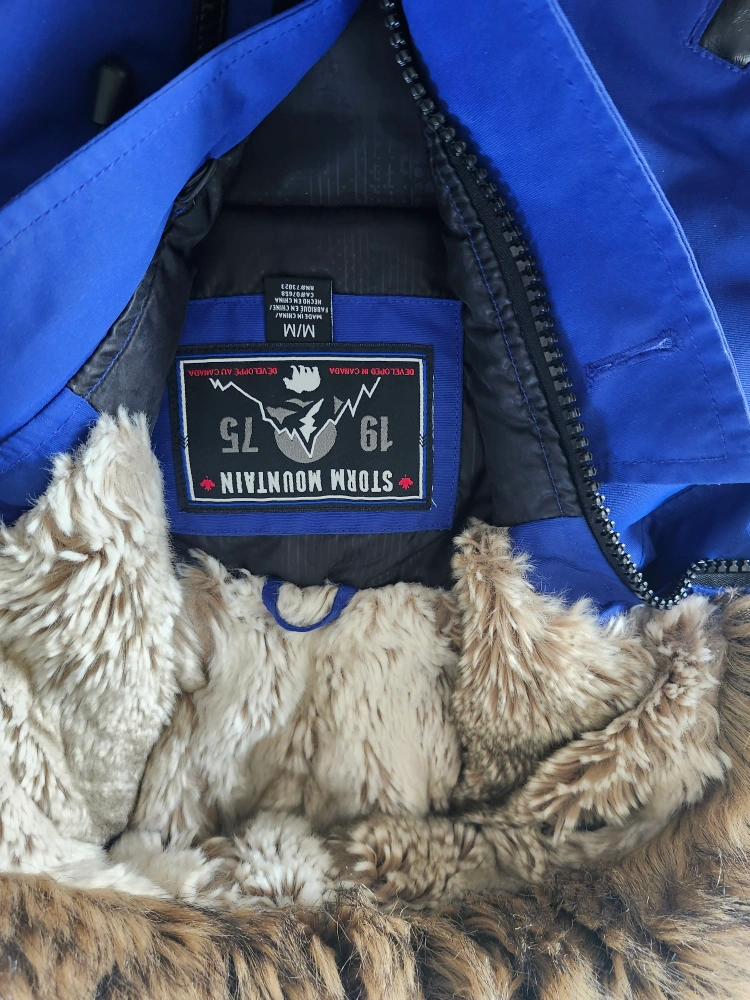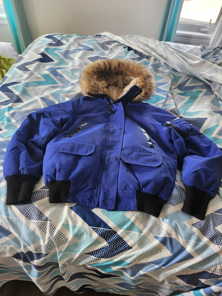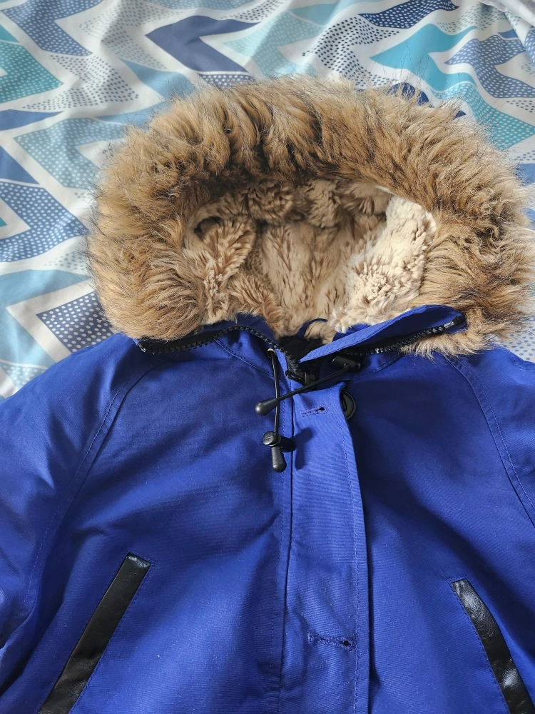 A blue winter coat. Features a hood with fur lining. A front zipper closure. Black trim and black cuffs. It is a perfect piece for keeping warm and enjoying a quiet walk in nature.