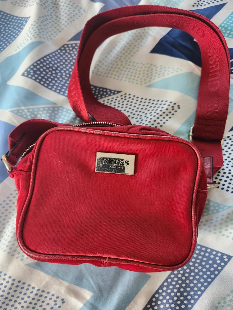 Lovely red Guess crossbody bag. Features a long strap and top zipper. Perfect to bring along with you when you need to be hands-free.