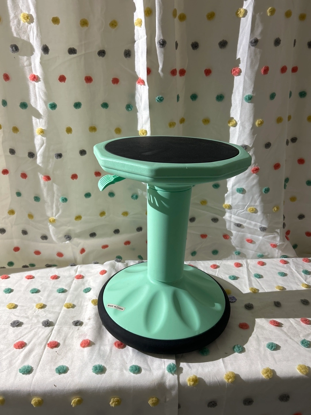 Mint-coloured adjustable wobble stool. Round black base with a cushioned seat. A very practical piece to keep you active while you work, relax with this stool. The seat is adjustable and it has a unique design.