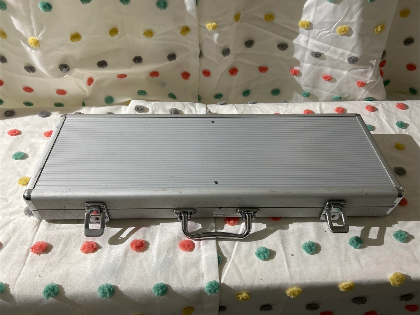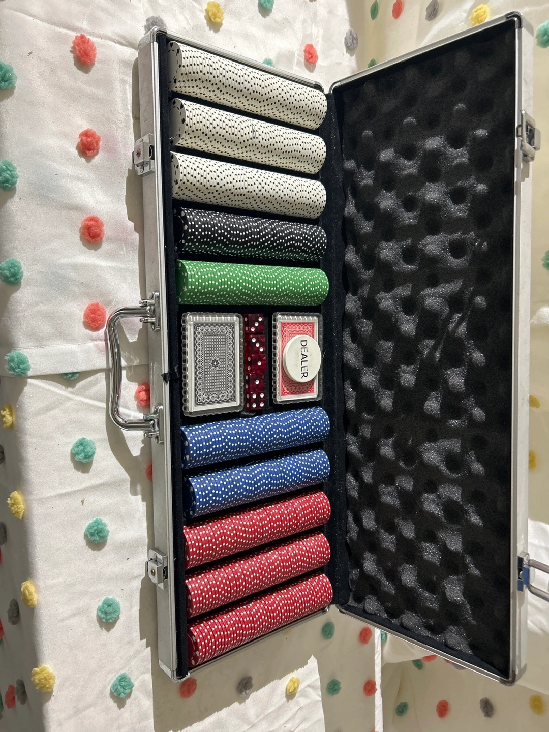 Comes in a metal case. Includes poker chips, playing cards, and dice. A great item to have for game night to relax and have some fun.