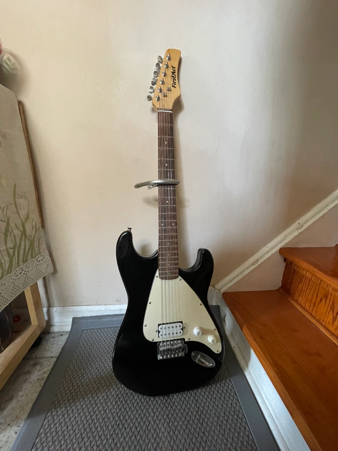 66Black electric guitar. White pickguard. Six tuning pegs. Includes a case, perfect for transporting your guitar wherever you may need to go. Also comes with a Capo!!!