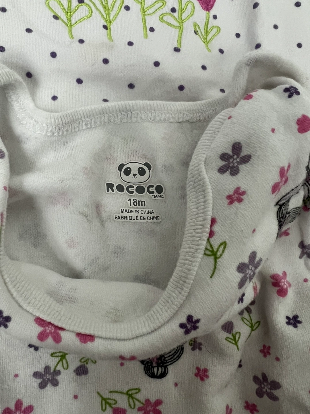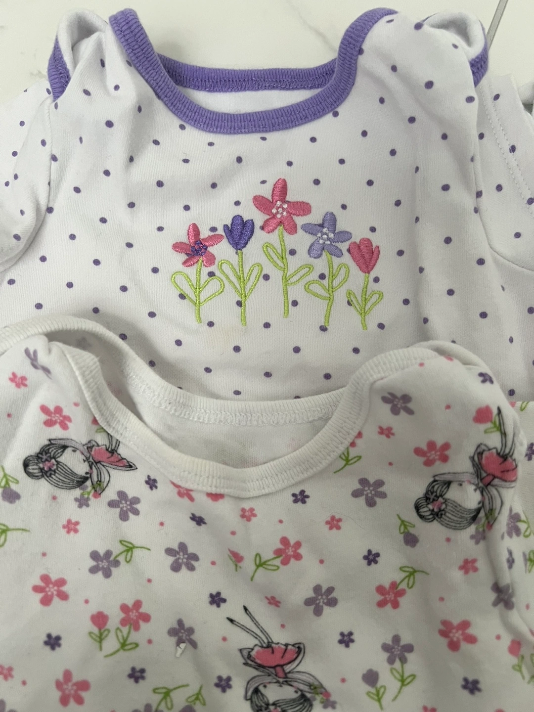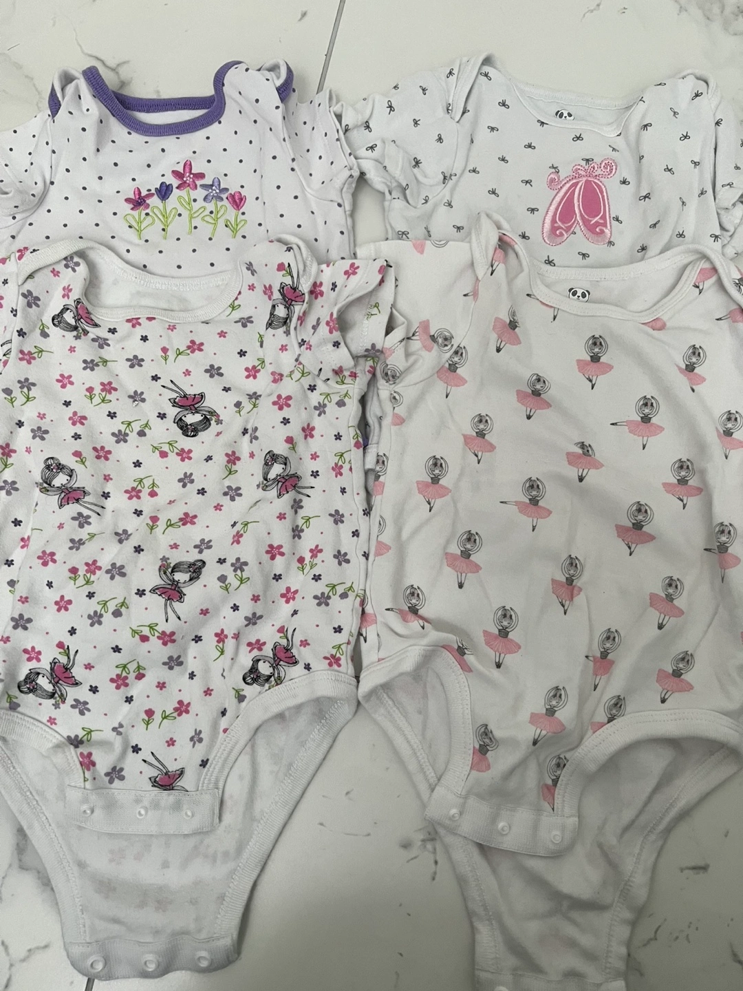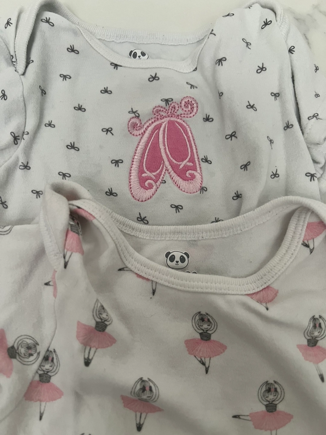 15A bundle of baby bodysuits featuring floral and ballerina designs. Some have short sleeves. Others have polka dots. A good selection of clothes for your little one.