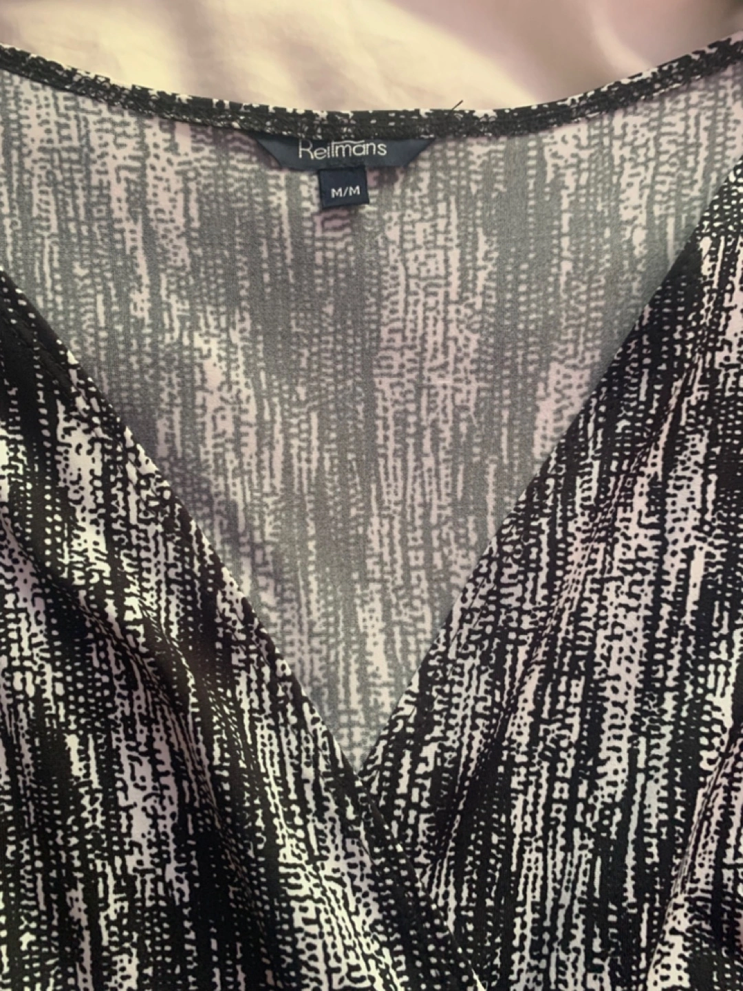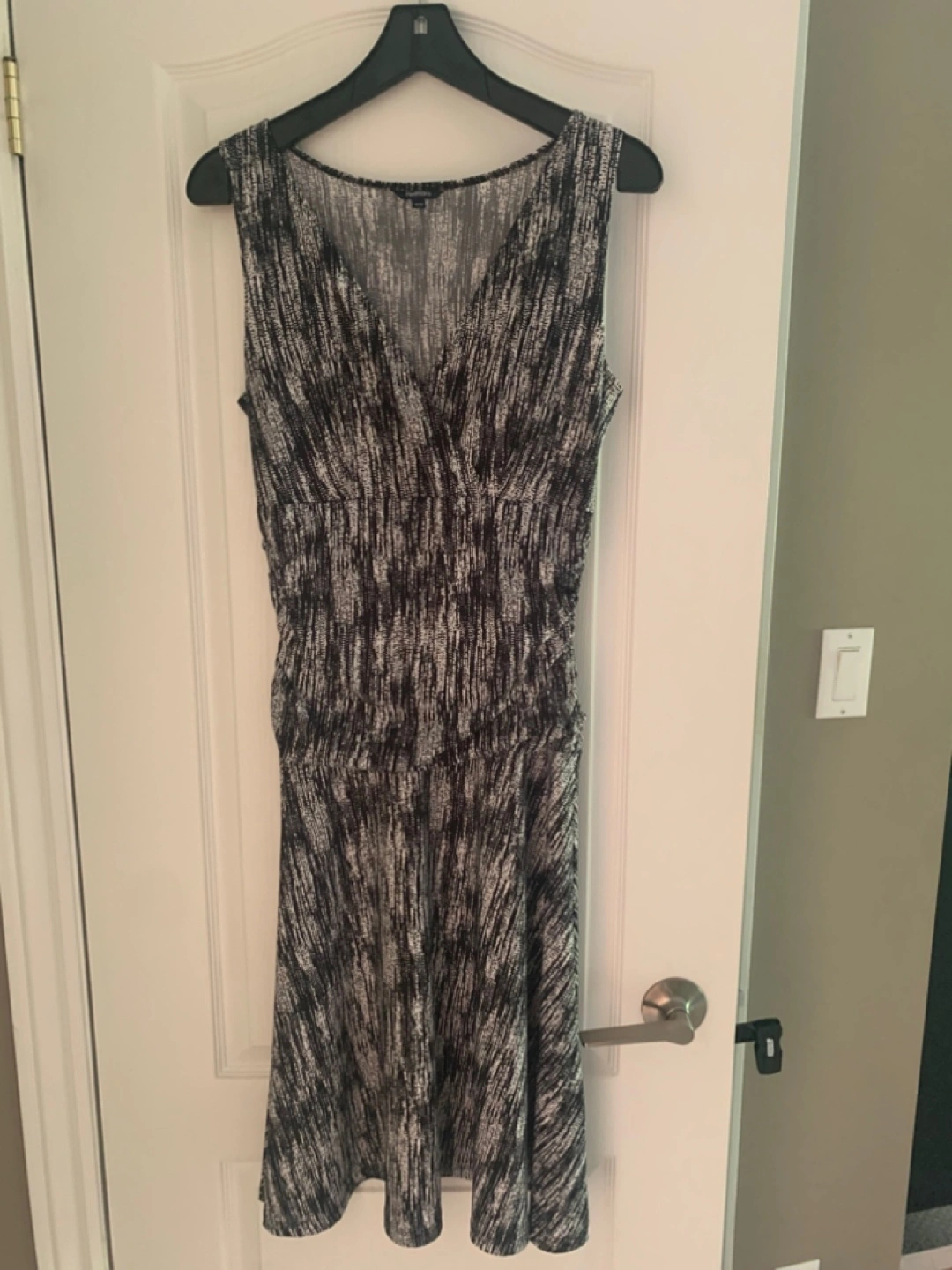 Dress with a v-neck. Sleeveless. Ruching at the waist. No zipper