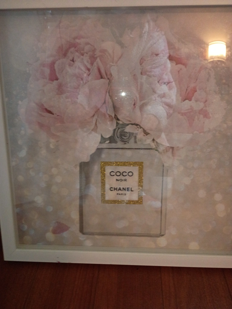 It is a framed print, featuring a Coco Noir Chanel design. The print shows a perfume bottle surrounded by soft pink flowers. The frame is white. Consider hanging this piece in a bedroom to create a sense of serenity.