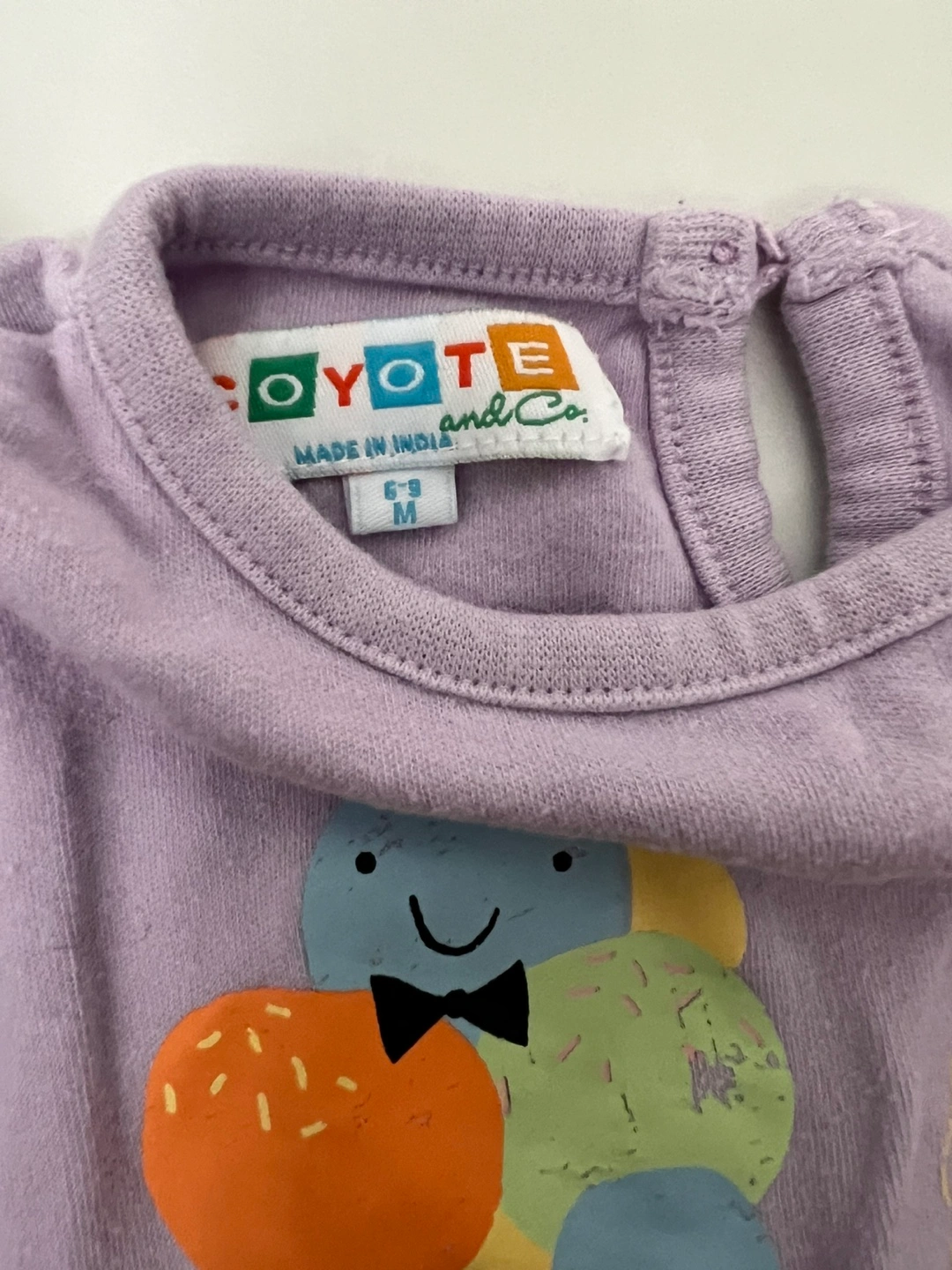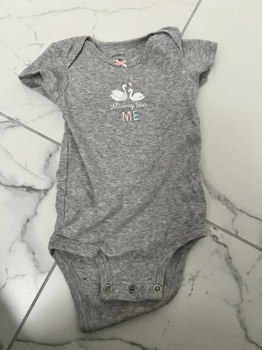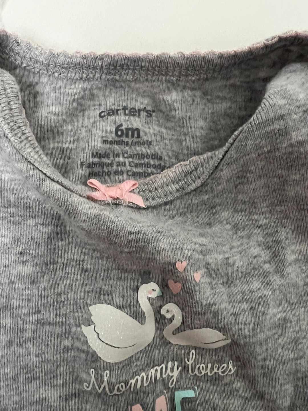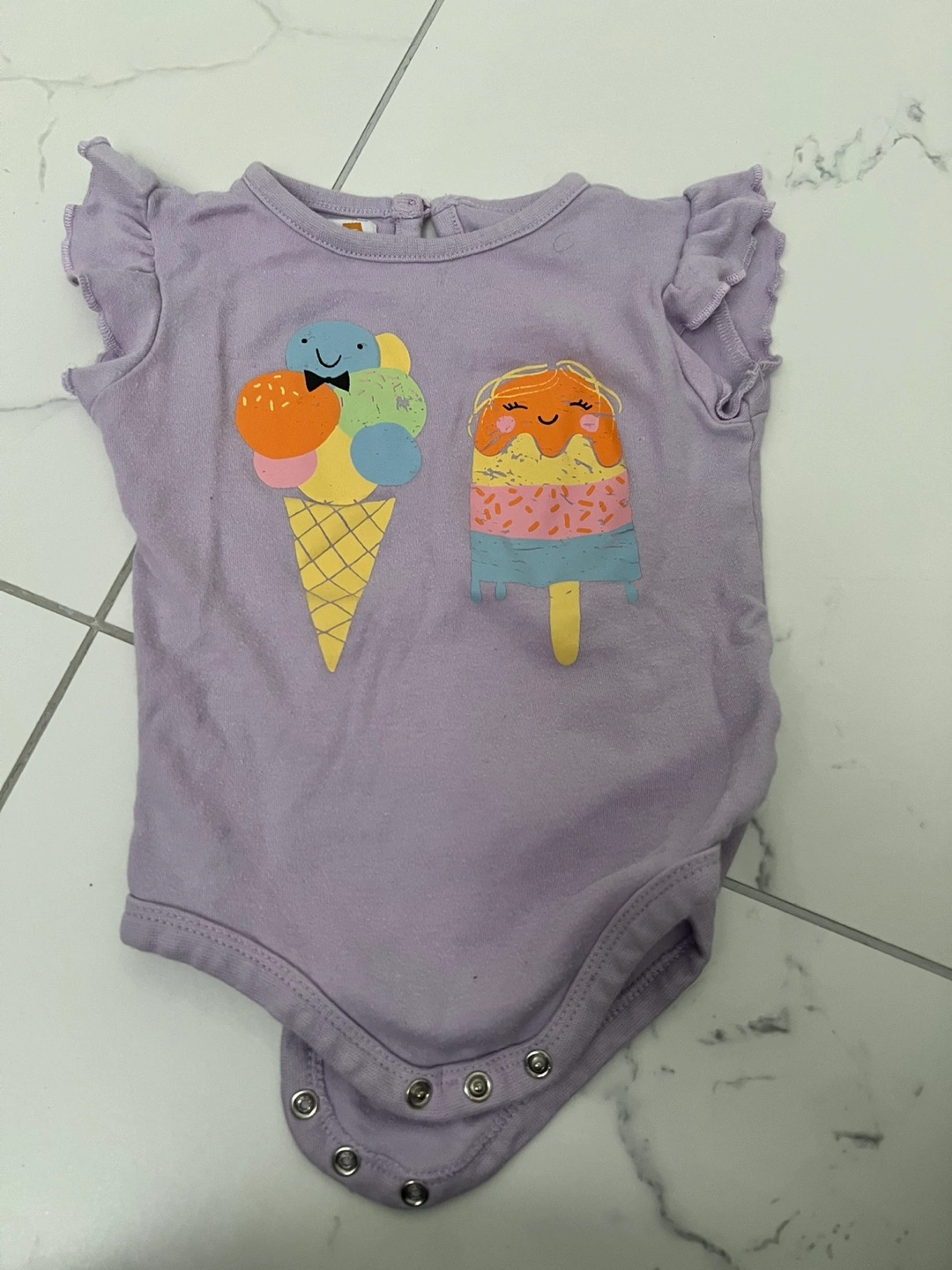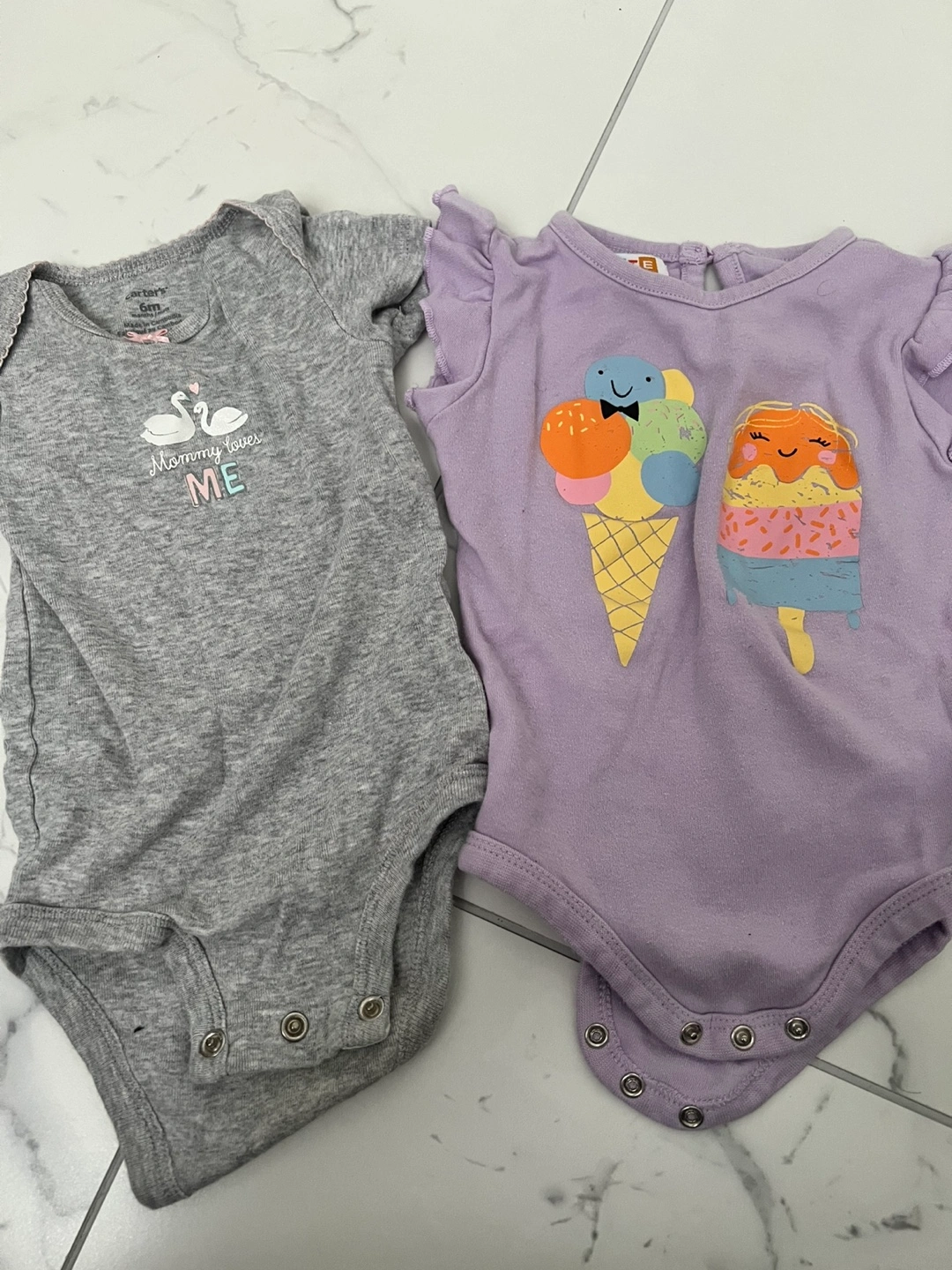 15Set of two bodysuits. One bodysuit is a grey colour with a 'Mommy loves me' swan design. The other is purple with an ice cream design. These bodysuits will ensure your little one feels comfy all day long.