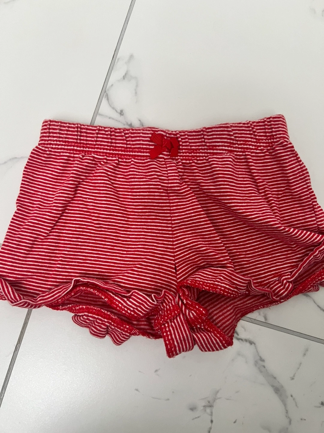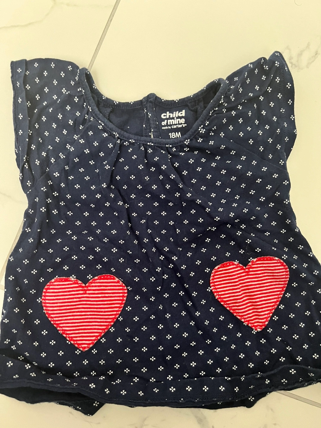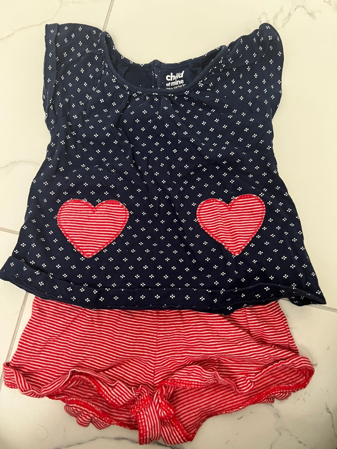 15Baby outfit set. The top is navy blue with white crosses. Features two red hearts. The shorts are red and white striped, with a cute bow at the waist. It is perfect for a relaxing day at home.