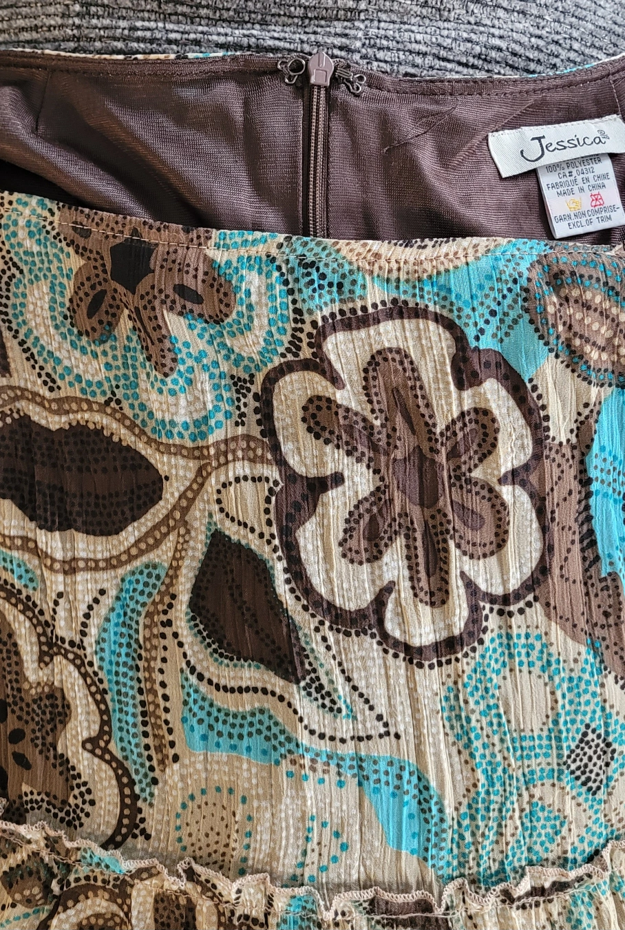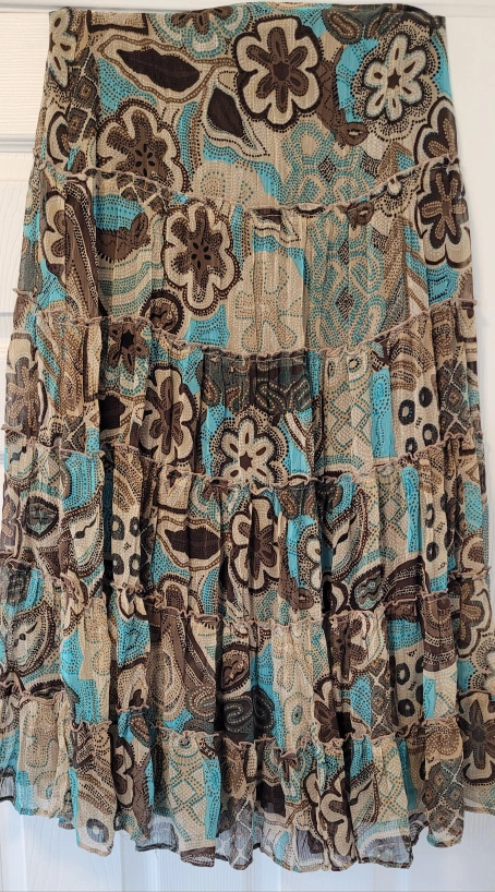 Tiered layers, and an elegant floral design. Very light and has zipper in the back. Goes well below the knees.