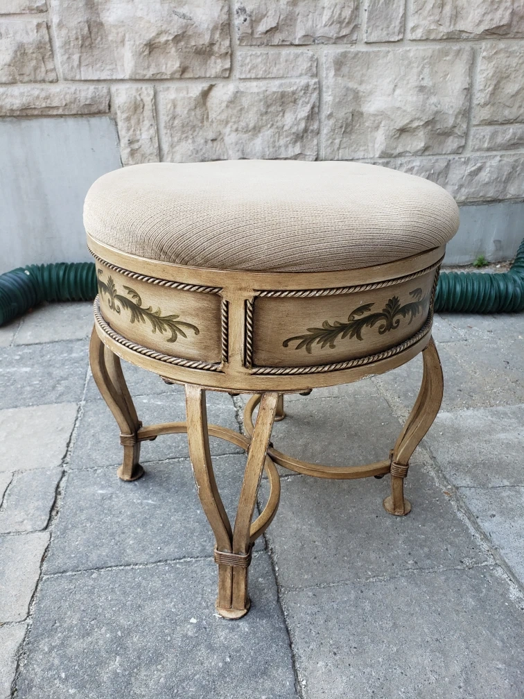 The stool features a round, cushioned seat. The base is a metal construction, with ornate curved legs. There is a decorative design on the side. This would be a lovely addition to any boudoir or vanity space, making you feel calm as you take a moment for yourself.