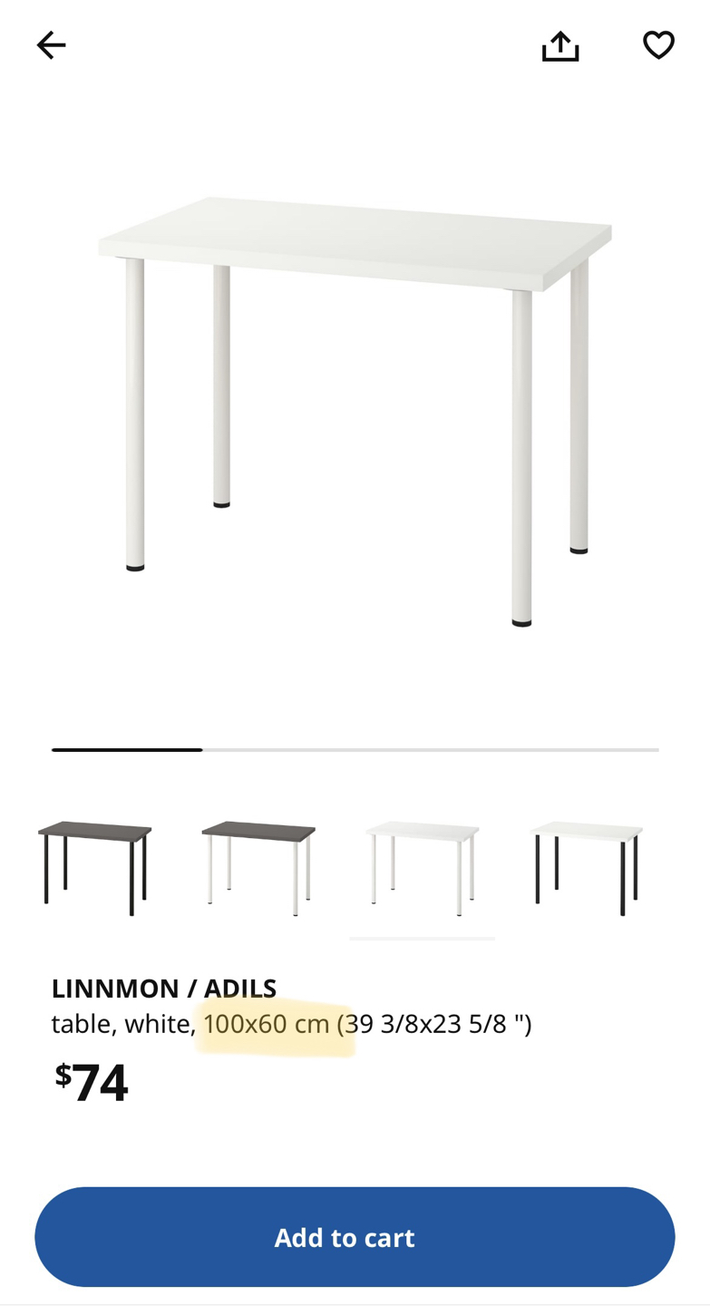 1 / 21 / 2Buy & SellIKEA - desk (LINNMON/ADILS)IKEA - desk (LINNMON/ADILS)$35100*60 Likely new. *Pick up onlyConditionLike newWHERE TO MEETCheck LocationView MapSELLERsho0996Willowdale E367 reviews3 chats·2 favorites·118 viewsSEND CHAT TO SELLERHi sho0996! I’m interested in your listing.Hi sho0996! I’m interested in your listing.Get the Karrot app to chatSign In to chat