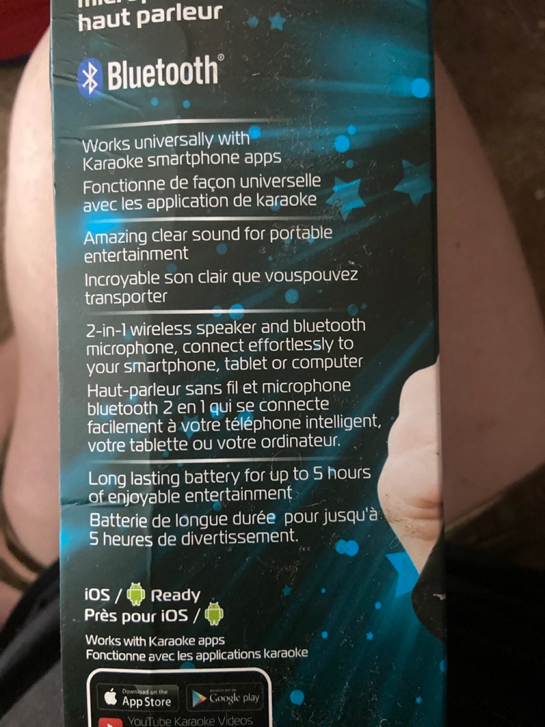 101Bluetooth karaoke microphone and speaker. A perfect item to use while winding down after a long day. It has a 2-in-1 design. It can be used with smartphone apps. It has a long-lasting battery for up to 5 hours. Never used. Box is a bit beat up though