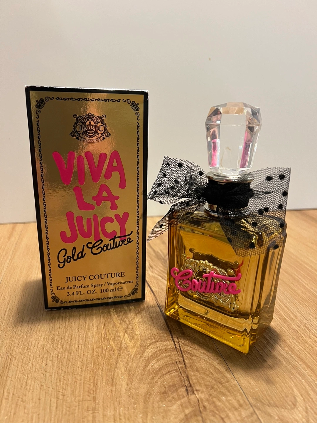 Juicy Couture Viva La Juicy Gold Couture EDP, 100ml. Purchased in around 2021. Judging by the weight of the bottle and my memory, it is 20-30% used. There is a small stain on the bottle cap.